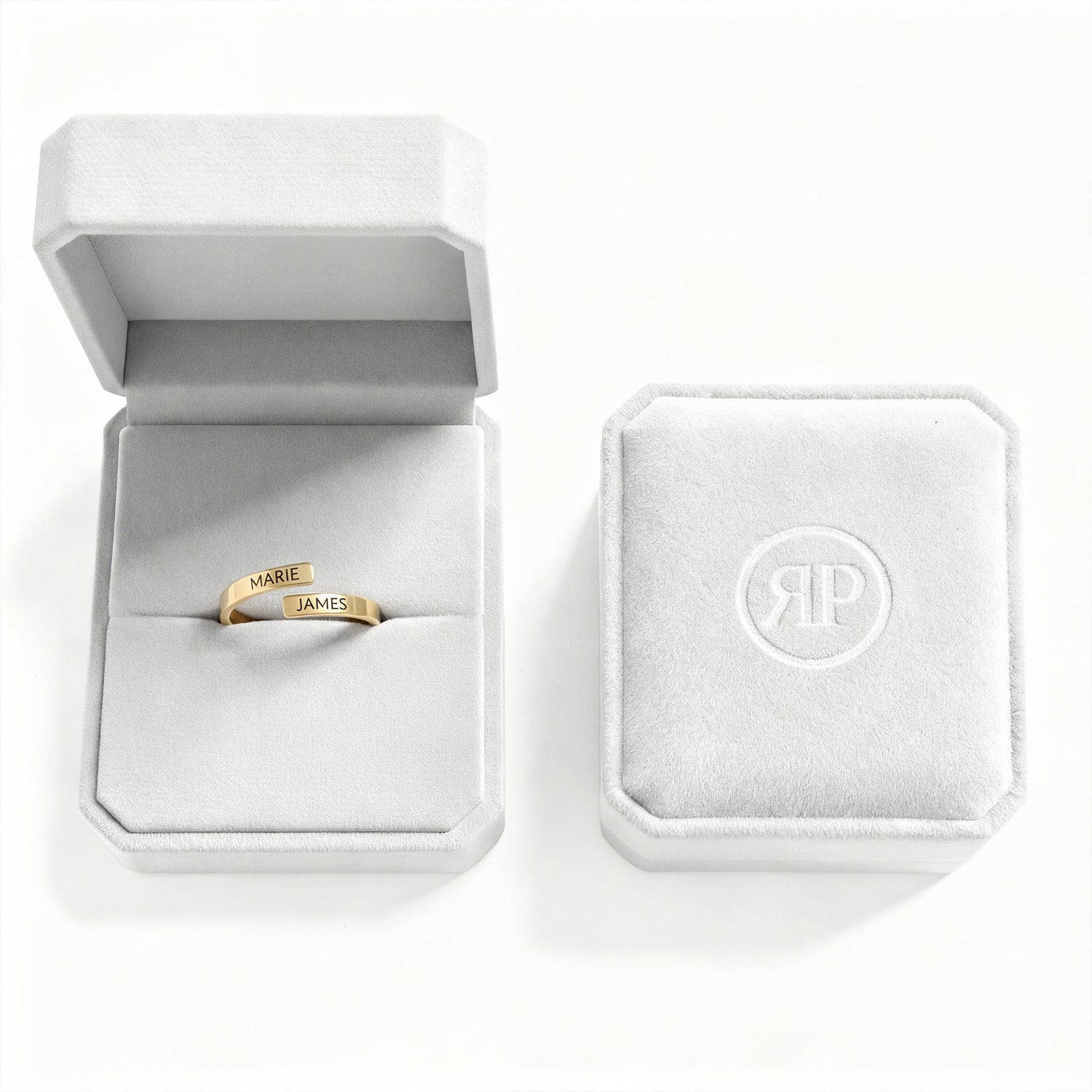 Wyrafinowany otwarty pierścionek z dwoma motywami inicjałów na każdym końcu, symbolizujący więź między dwiema duszami. Jego smukły, nowoczesny design sprawia, że jest idealny na codzienną elegancję.
