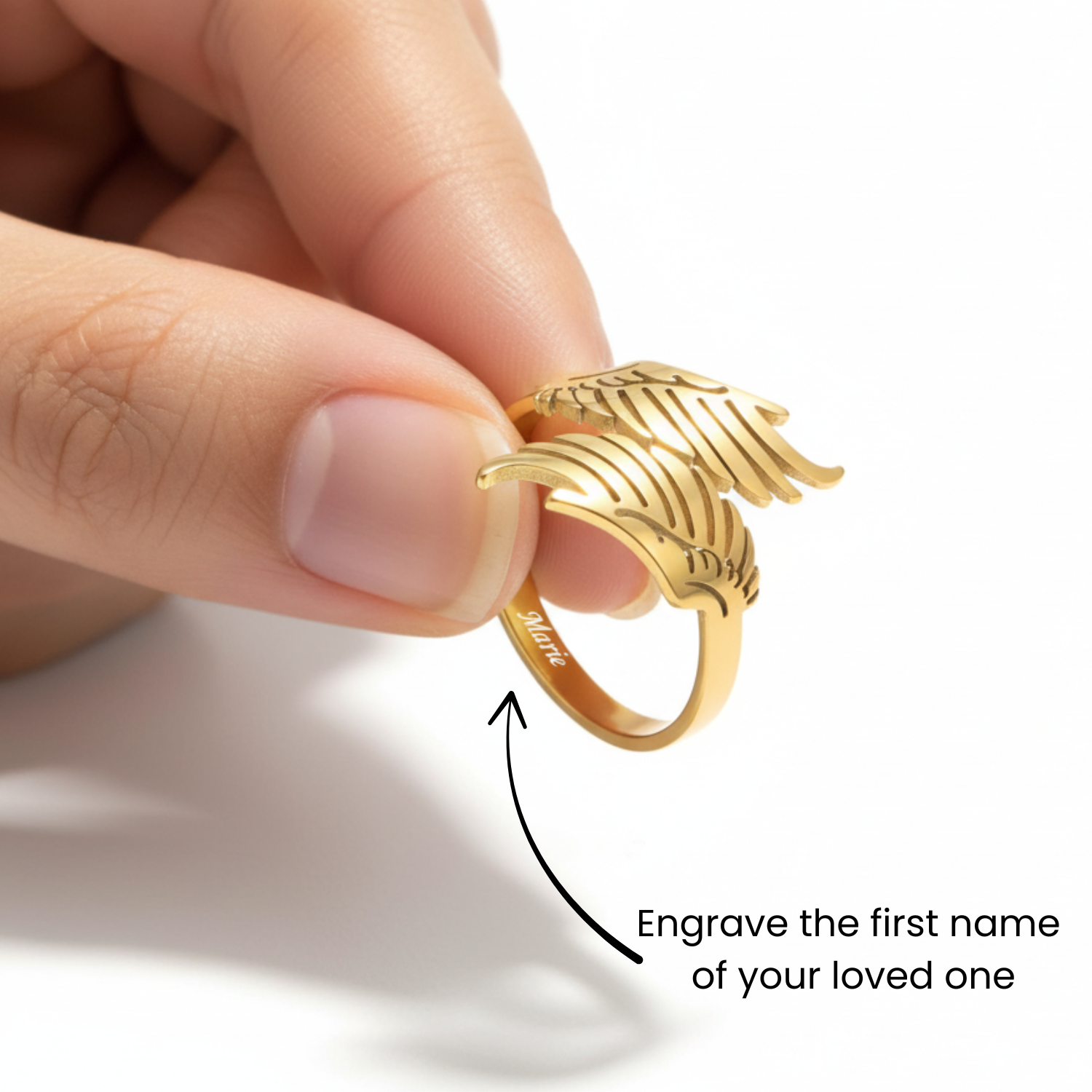 Dzięki eleganckiemu wzorowi anielskich skrzydeł, ten personalizowany pierścionek to coś więcej niż biżuteria, symbolizuje wieczną więź. Ponadczasowy i regulowany, idealnie pasuje na każdą okazję, czy to upamiętniając cenną pamięć, czy wyrażając trwałą miłość.