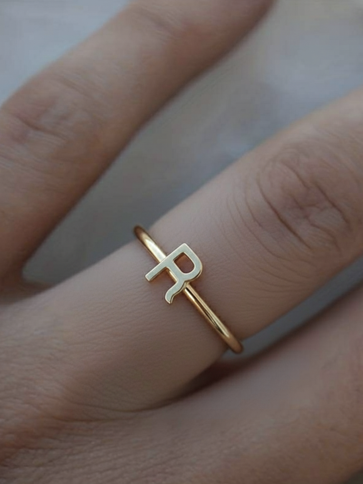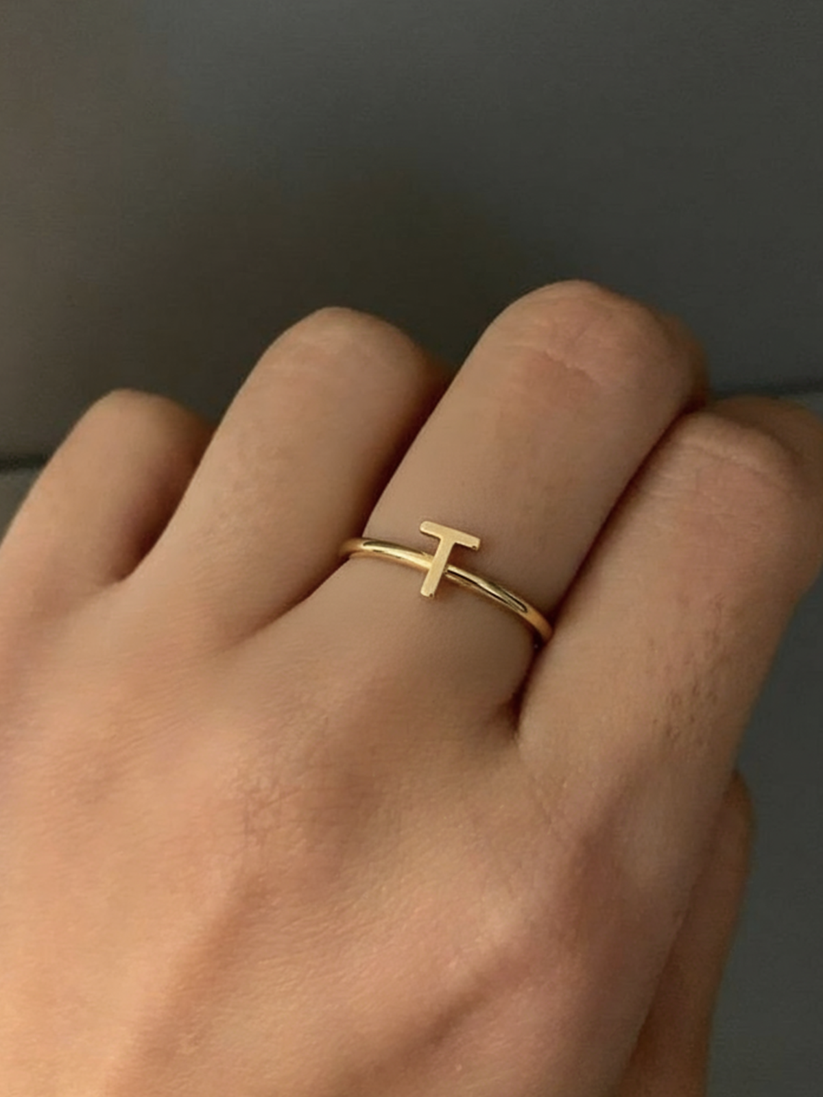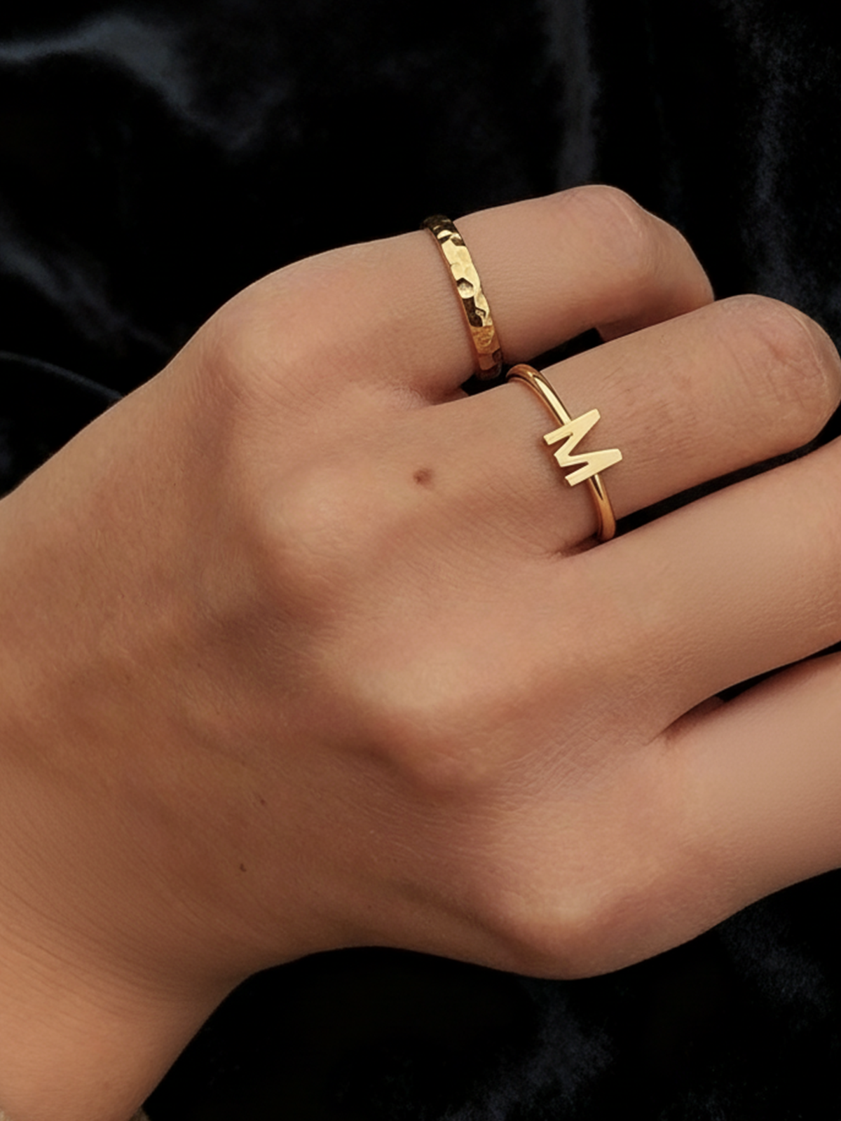 Dostępny w złocie lub srebrze, idealnie dopasowuje się do wszystkich rozmiarów i osobowości. Niezależnie czy to pierwsza litera Twojego imienia, czy kogoś bliskiego, ten pierścionek staje się prostym, lecz silnym symbolem tego, co dla Ciebie ważne.
