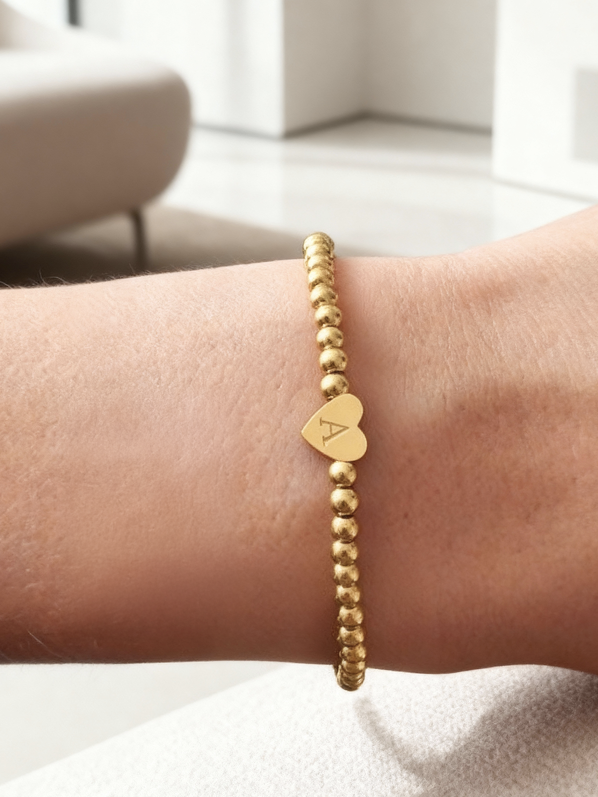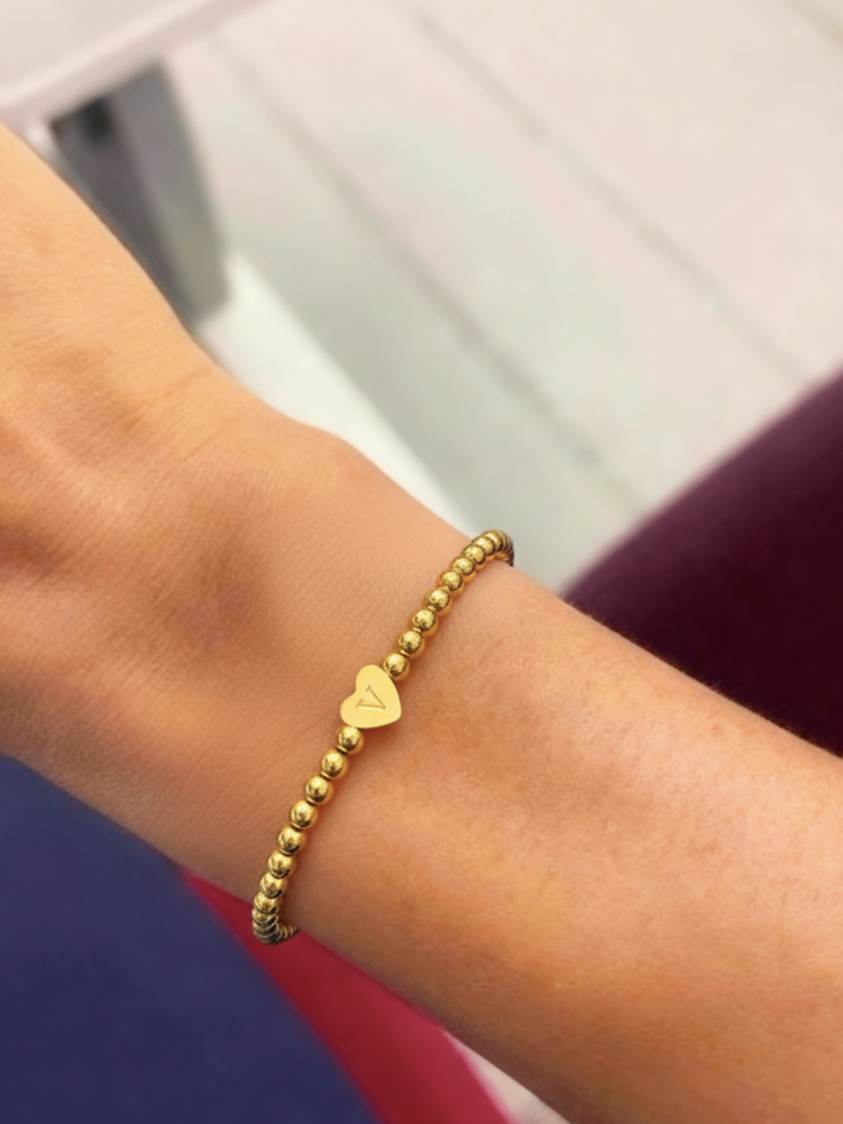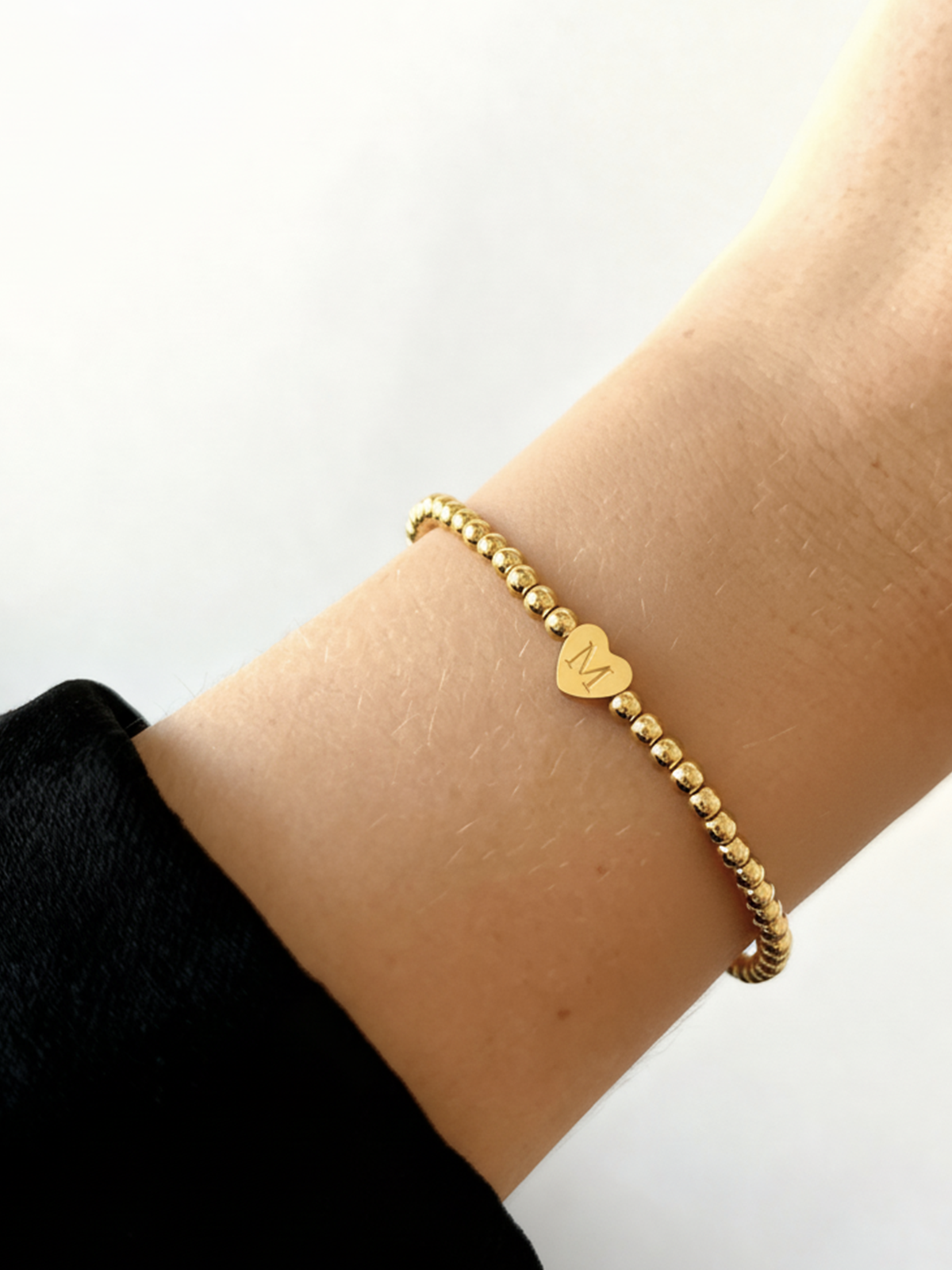Ta wyrafinowana bransoletka, wykonana ze złotych lub srebrnych koralików, jest ozdobiona małym centralnym sercem z wygrawerowanym wybranym przez Ciebie inicjałem. Symbolizując miłość, rodzinę lub przyjaźń, pasuje na wszystkie nadgarstki dzięki wygodnemu, rozciągliwemu designowi. Niezależnie czy jako prezent, czy dla siebie, ten minimalistyczny i szykowny element wyraża wyjątkową więź.