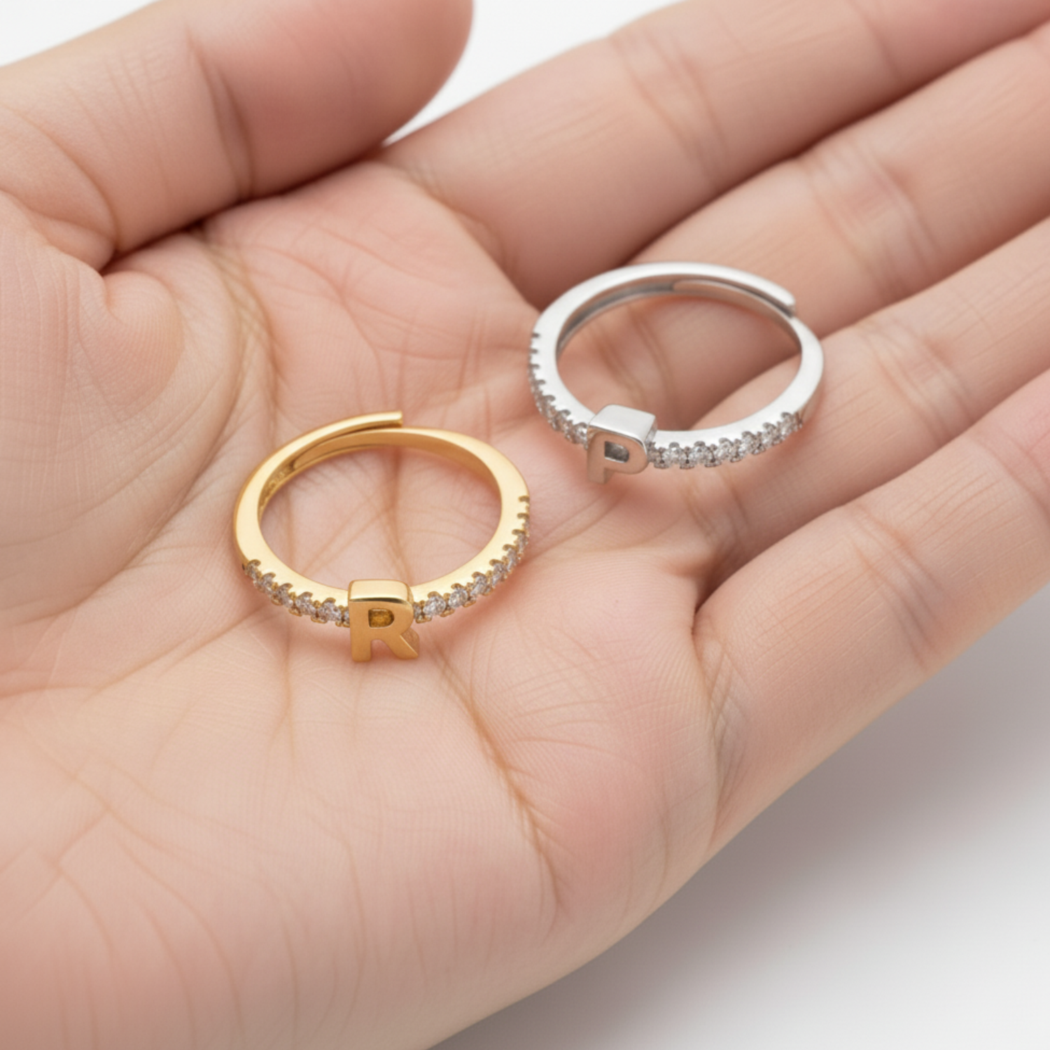 Podkreśl swój styl tym oszałamiającym pierścionkiem ozdobionym błyszczącymi cyrkoniami i delikatną literą. Jego subtelny i elegancki design łapie światło przy każdym ruchu, dodając Twojej dłoni dyskretnego blasku. Niezależnie od tego, czy wybierzesz swoją własną Letter, czy ukochanej osoby, ten pierścionek staje się osobistym i cennym symbolem.