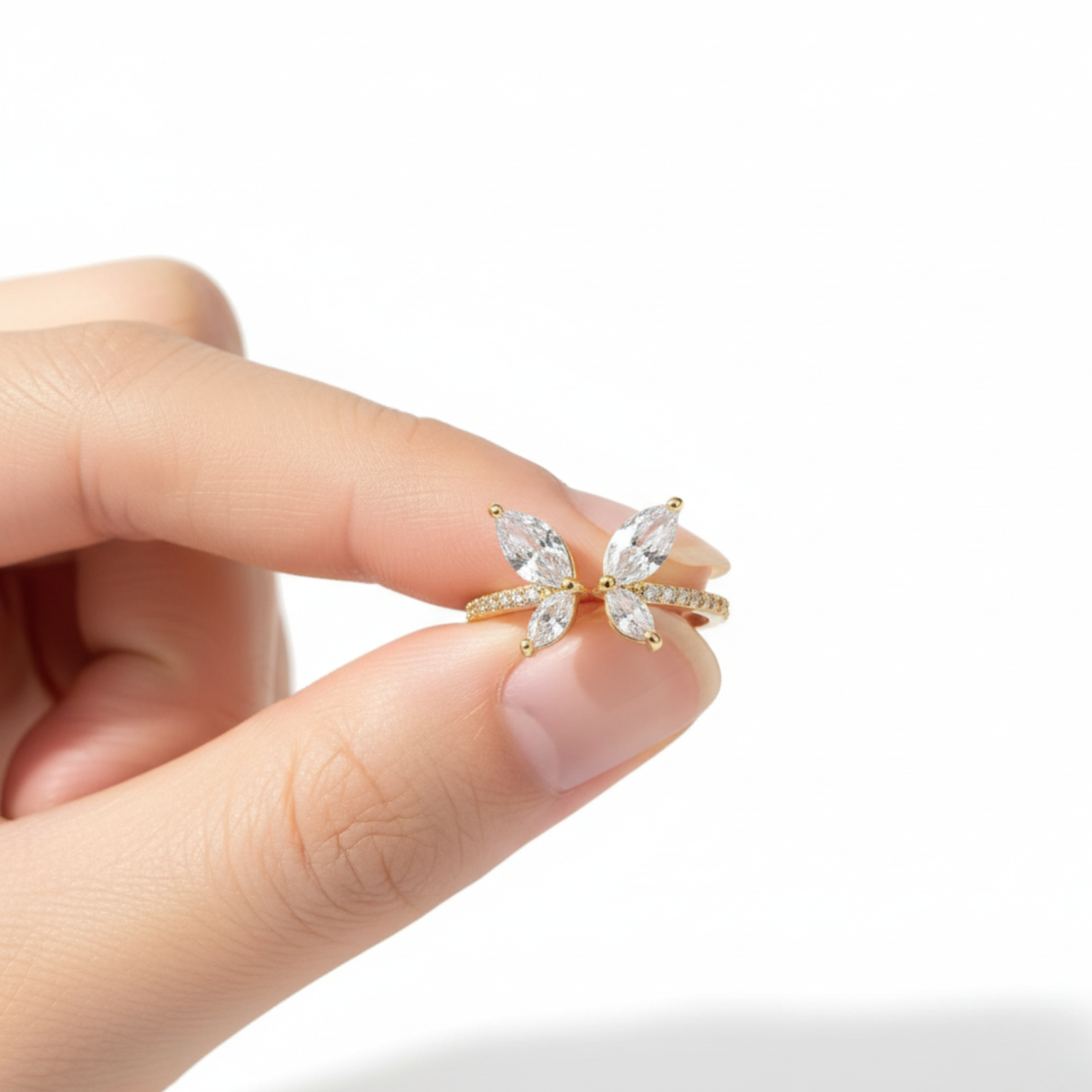 Elegancja w locie. Ten pierścionek z motylem uchwyca delikatność zawieszonej chwili, gdzie spotykają się piękno i wolność. Jego błyszczące skrzydła, ozdobione oszałamiającymi kryształami w szlifie marquise, zdają się ożyć przy najlżejszym podmuchu wiatru.