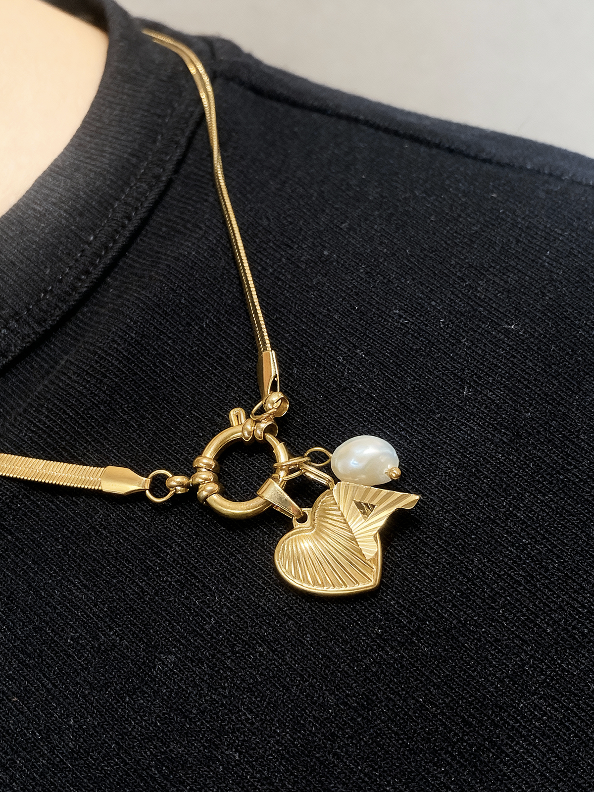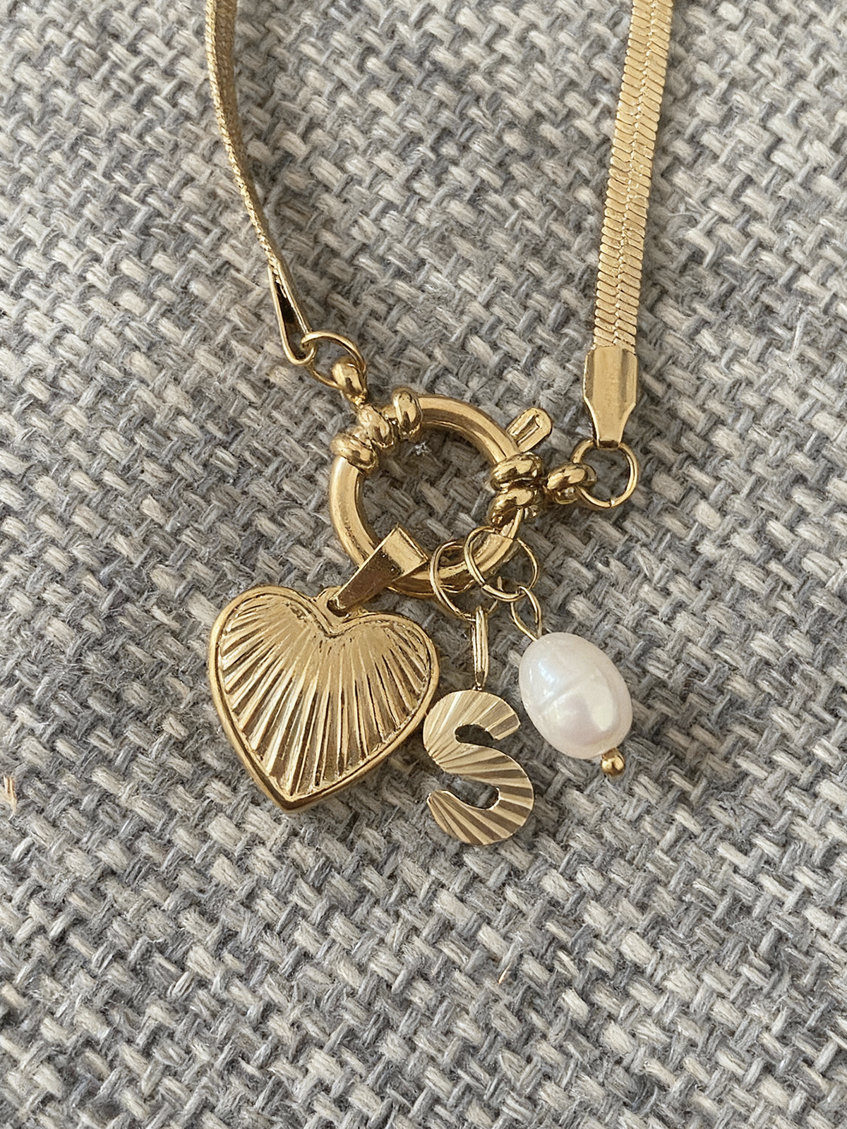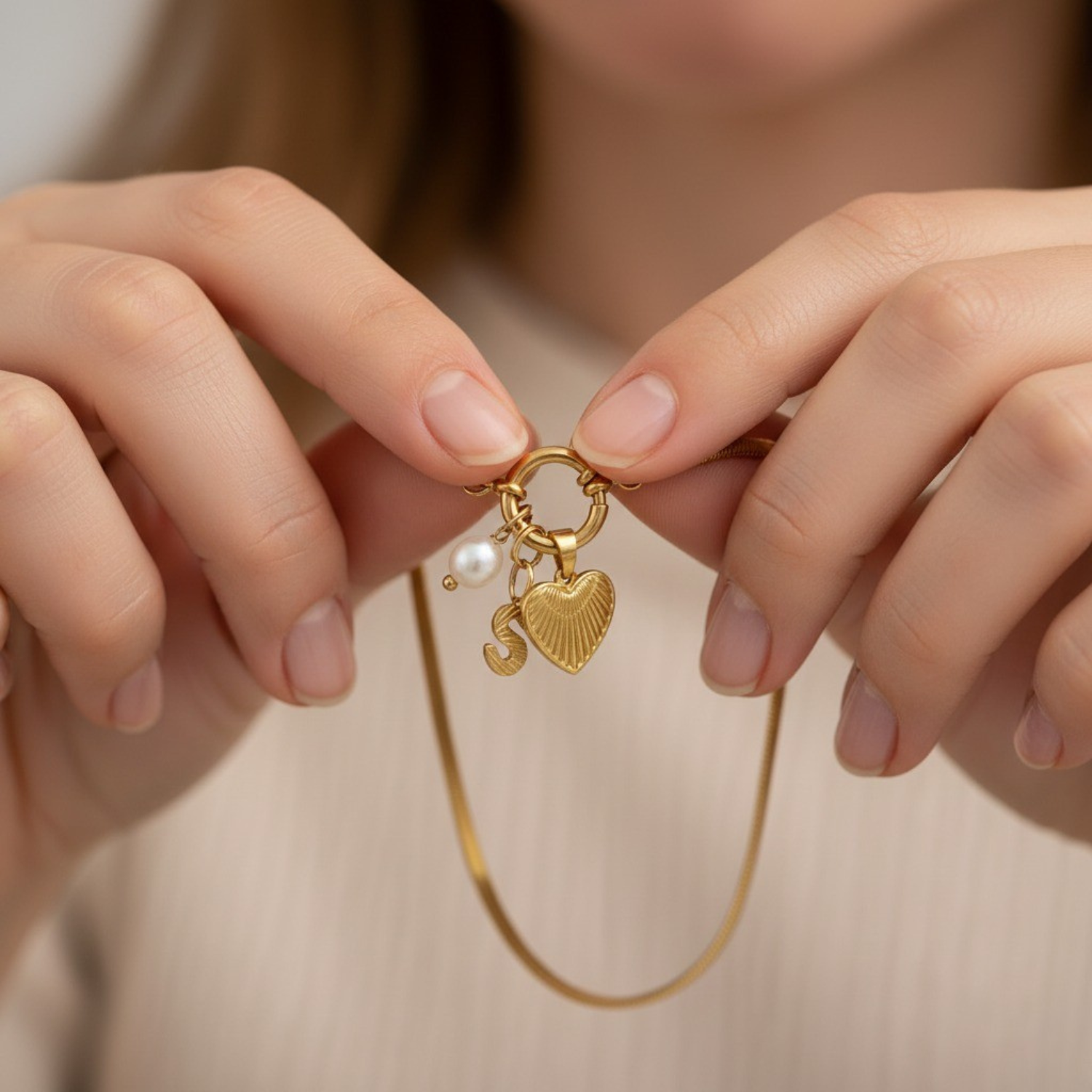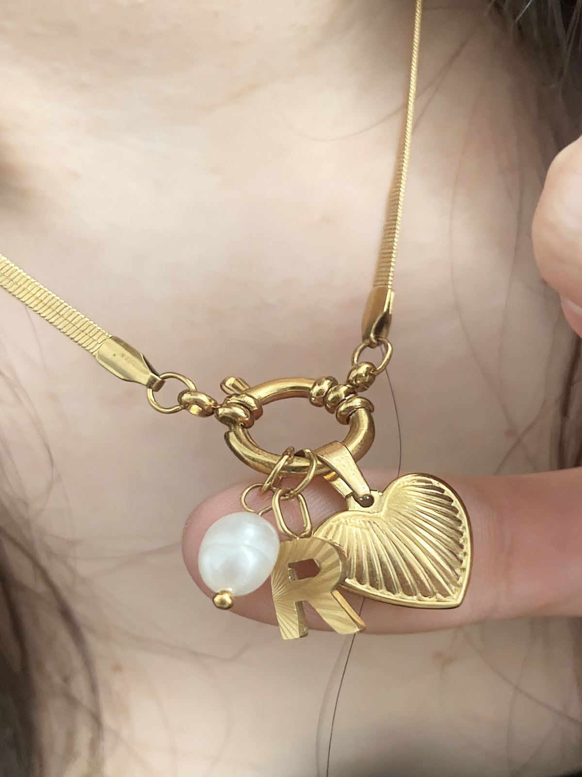 Jedien naszyjnik, trzy symbole. Ten unikalny element łączy spersonalizowaną literę, delikatnie fakturowane serce oraz naturalną białą perłę, tworząc intymny i elegancki przekaz. Każdy zawieszek opowiada historię : znacząca inicjał, miłość we wszystkich jej formach oraz ponadczasowa miękkość perły.