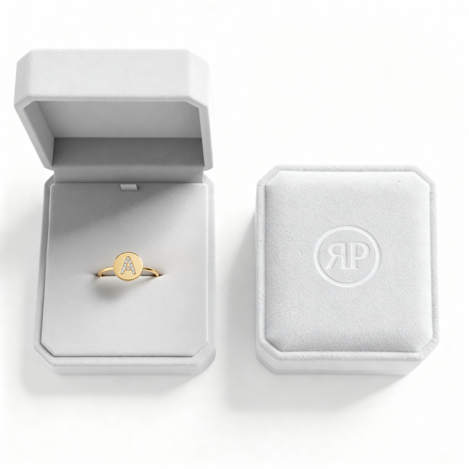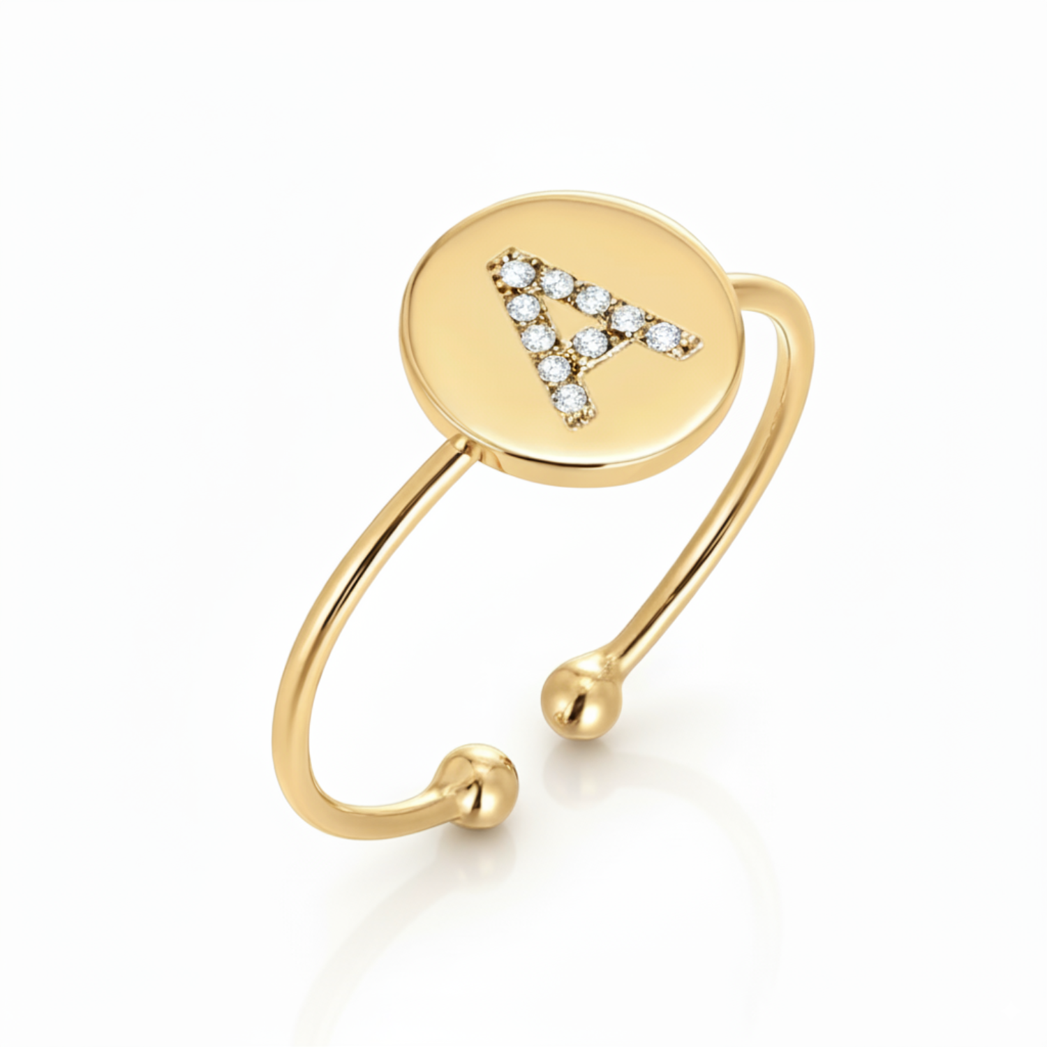Dodaj osobisty blask dzięki naszemu złotemu pierścionkowi z inicjałem ozdobionemu migoczącymi kryształami.