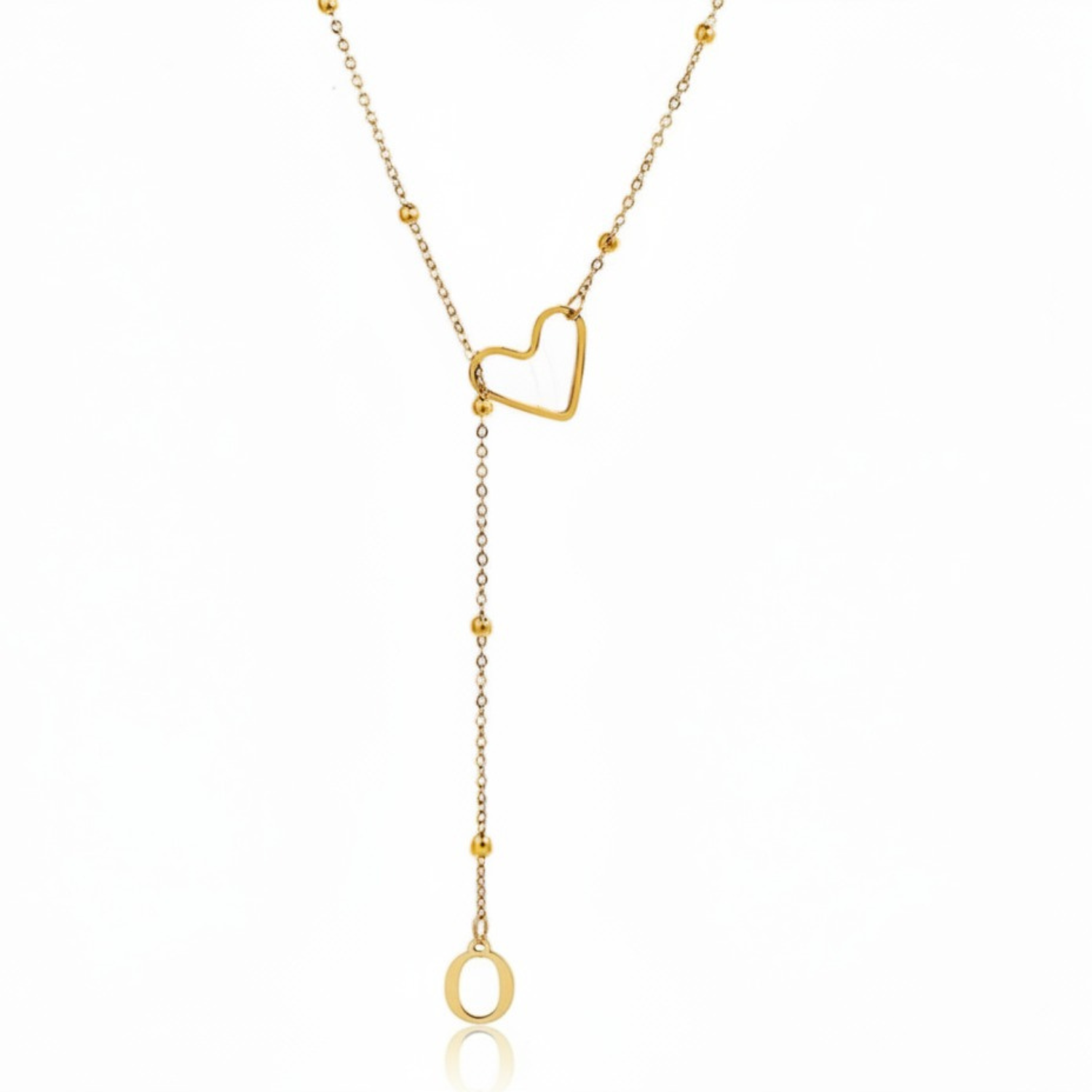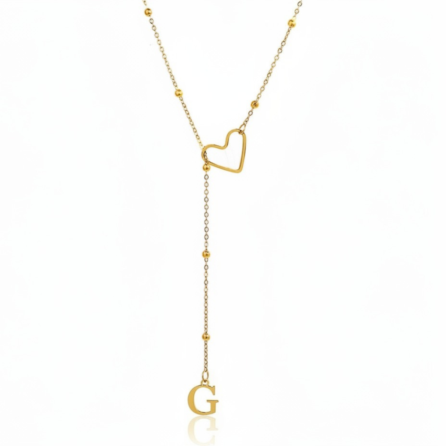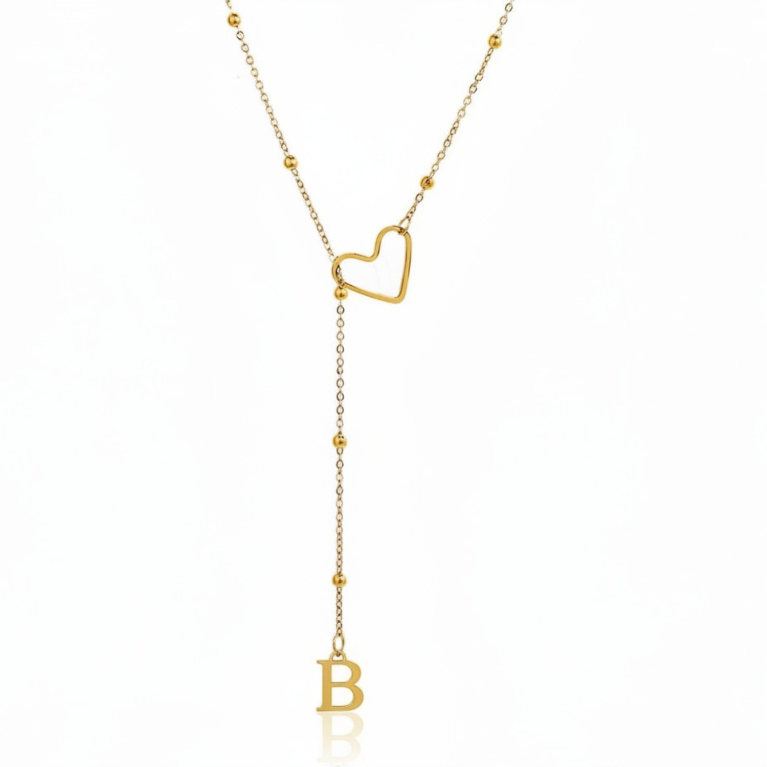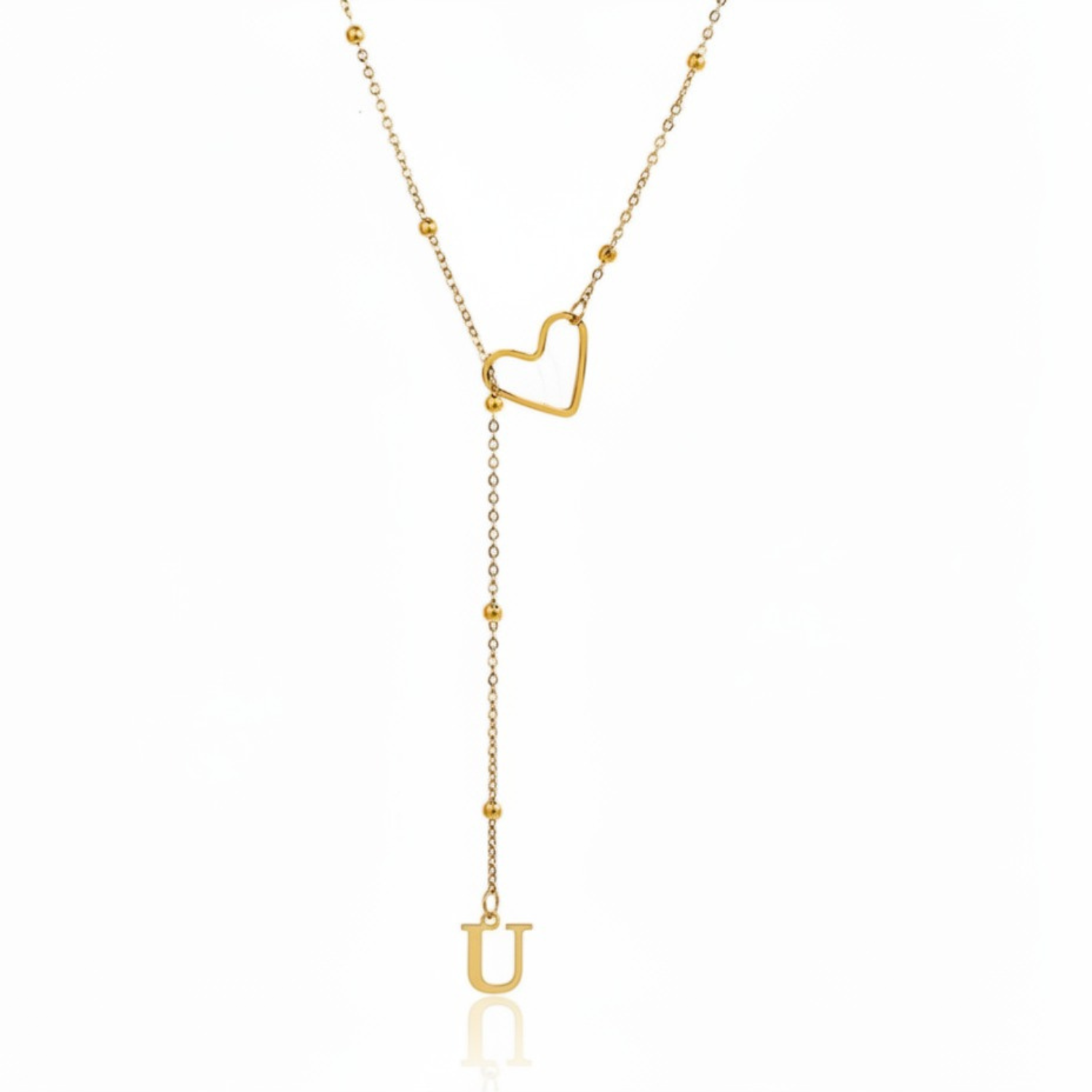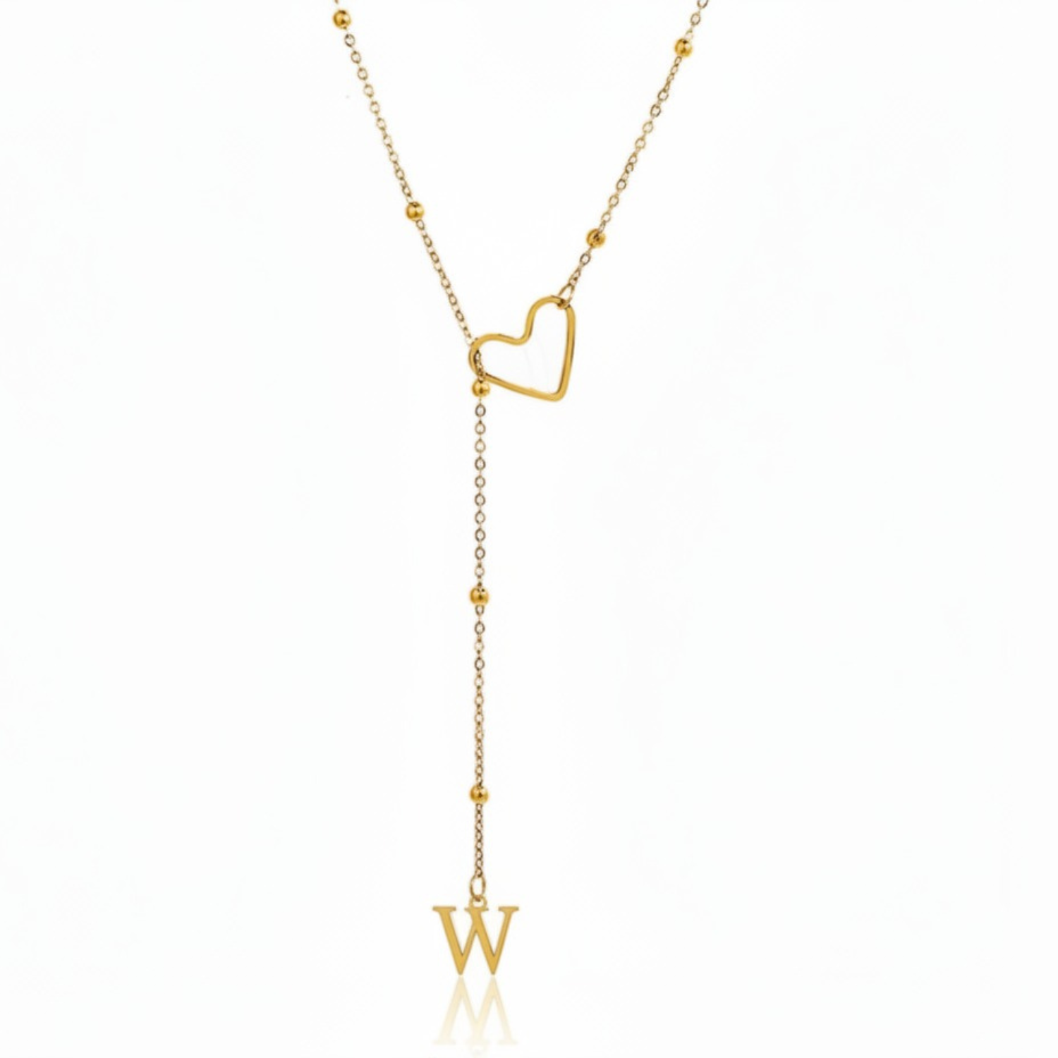 Ten wyrafinowany naszyjnik uchwyca istotę osobistej więzi: delikatnie zawieszona litera przechodzi przez złote serce, symbolizując głębokie i intymne przywiązanie.