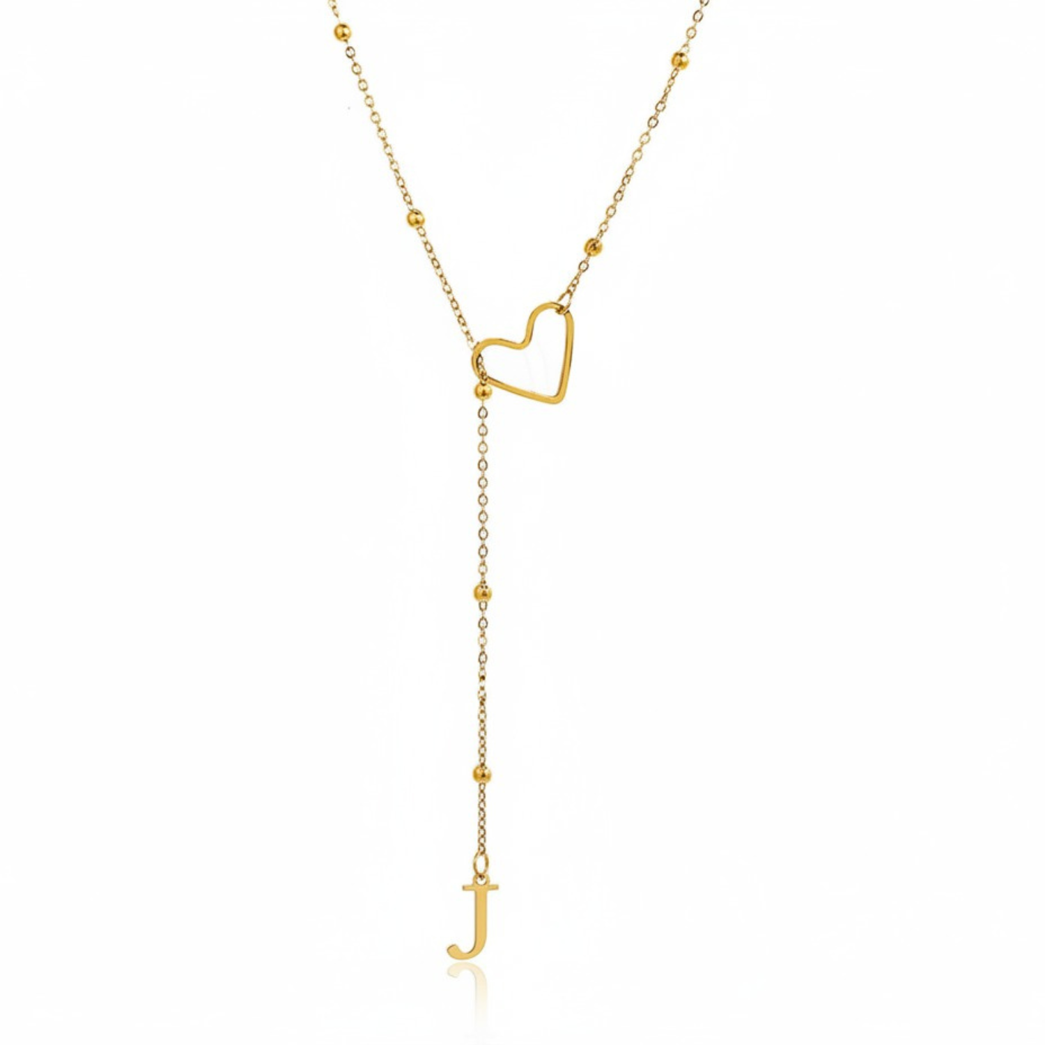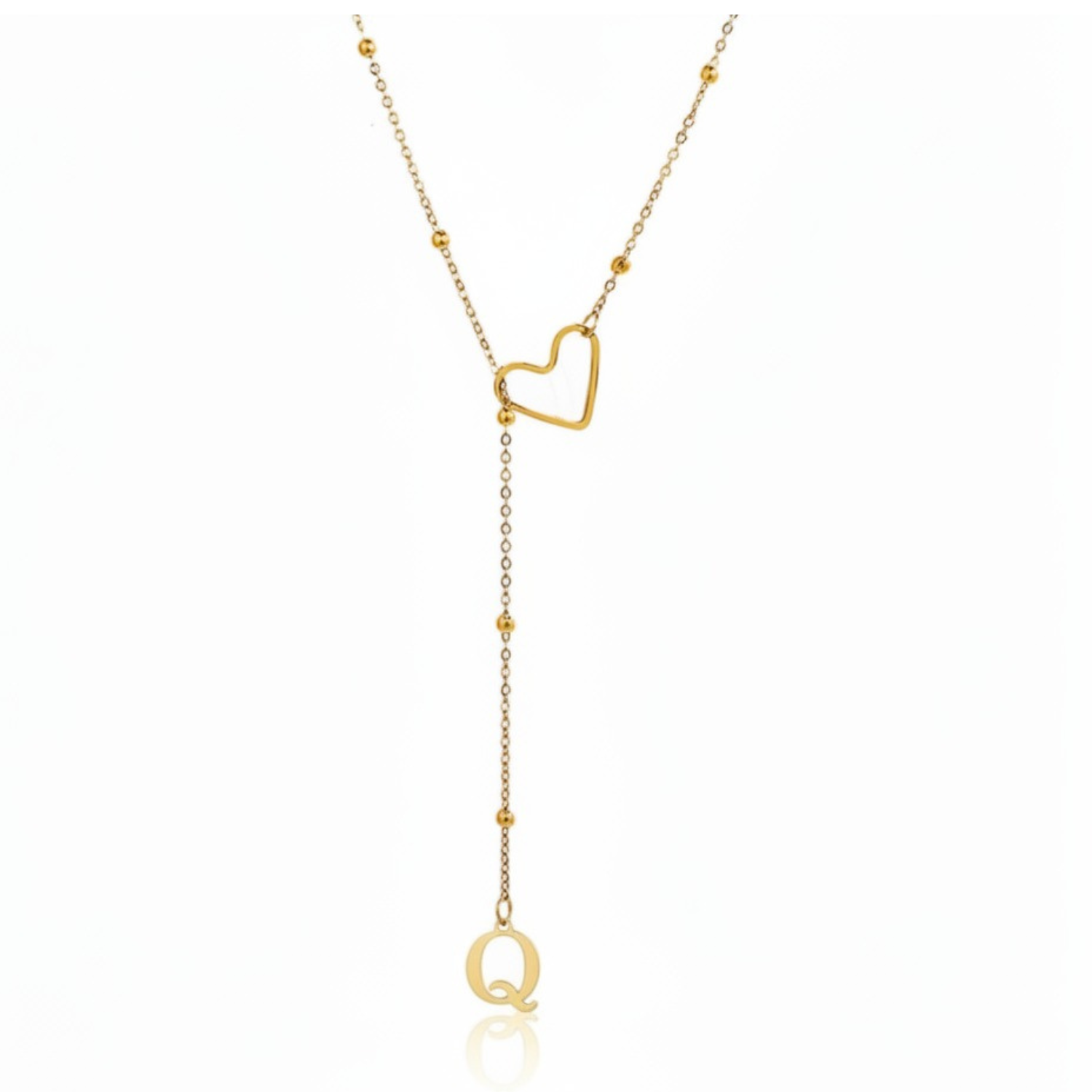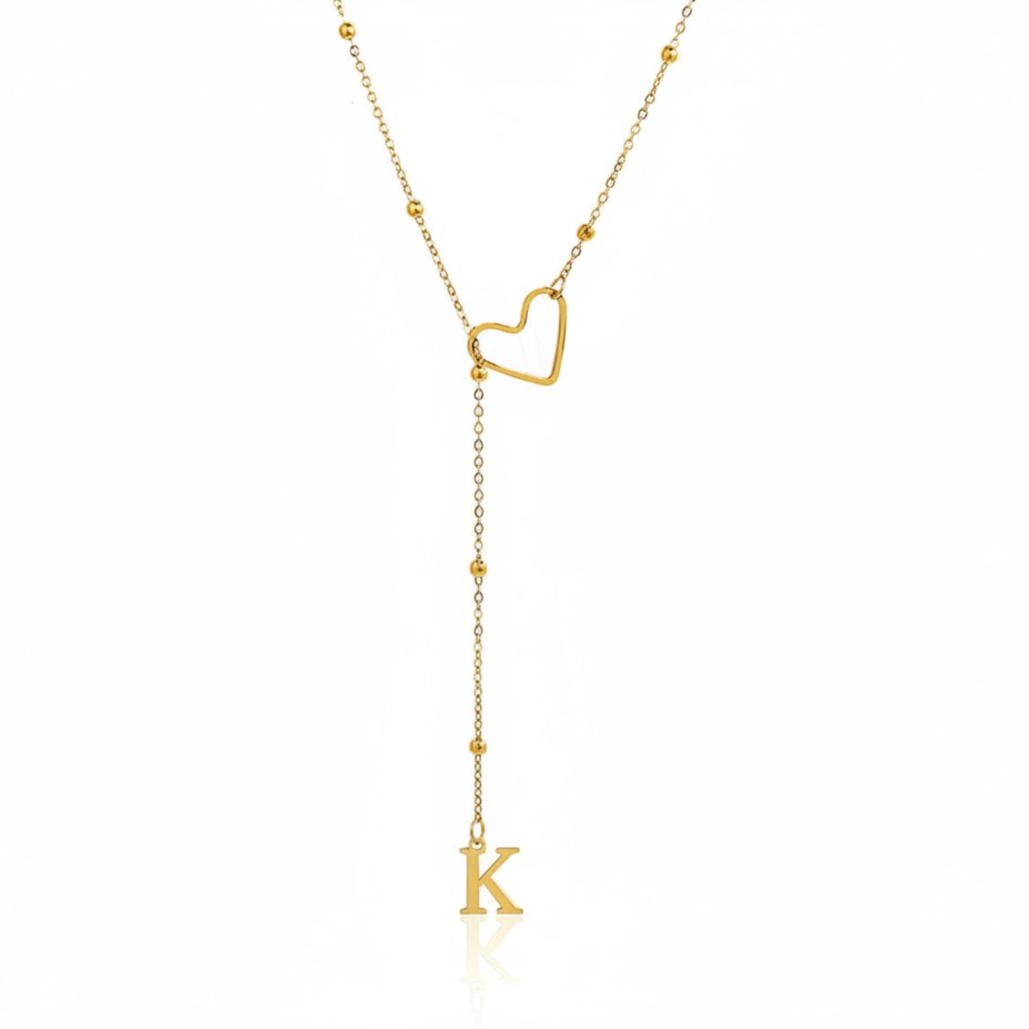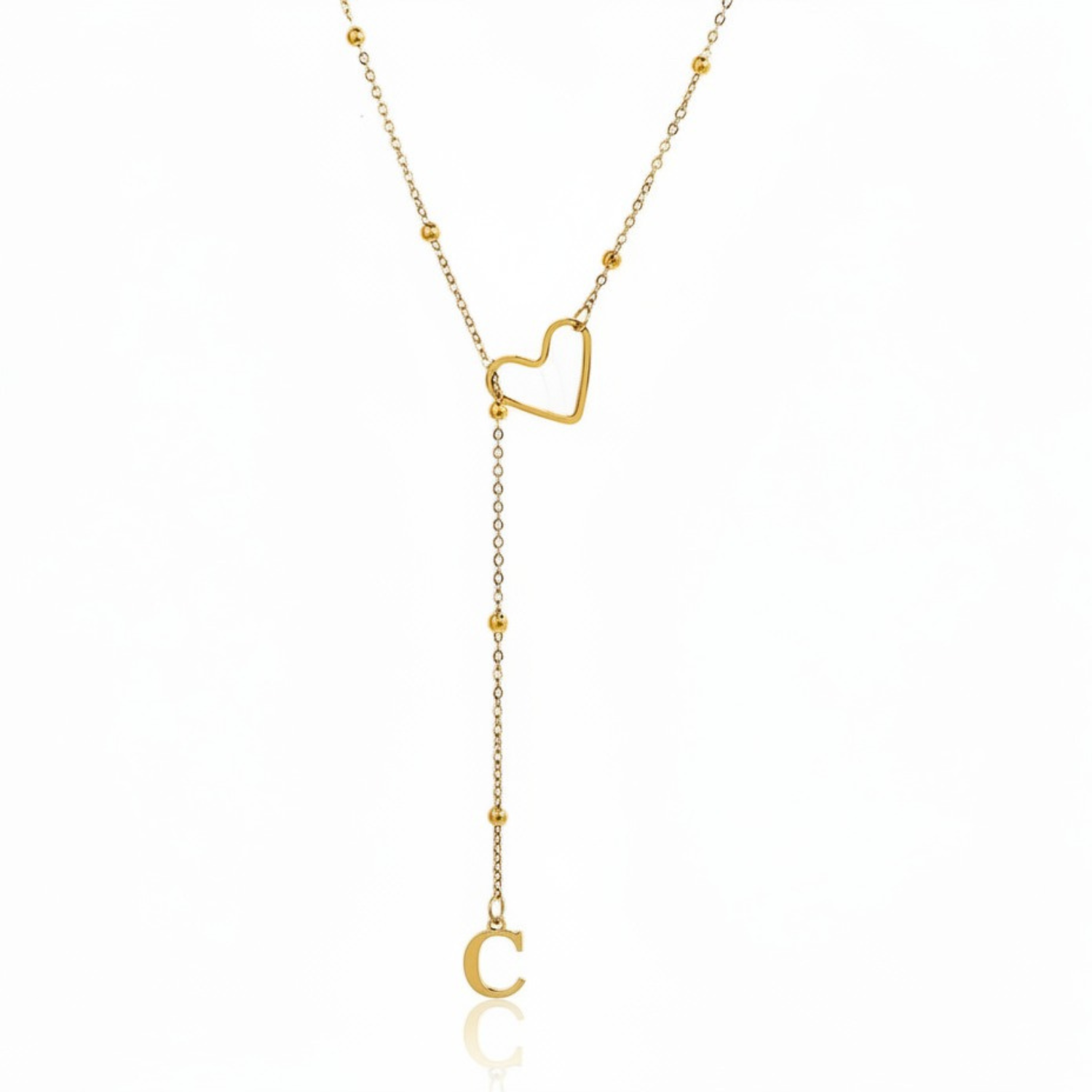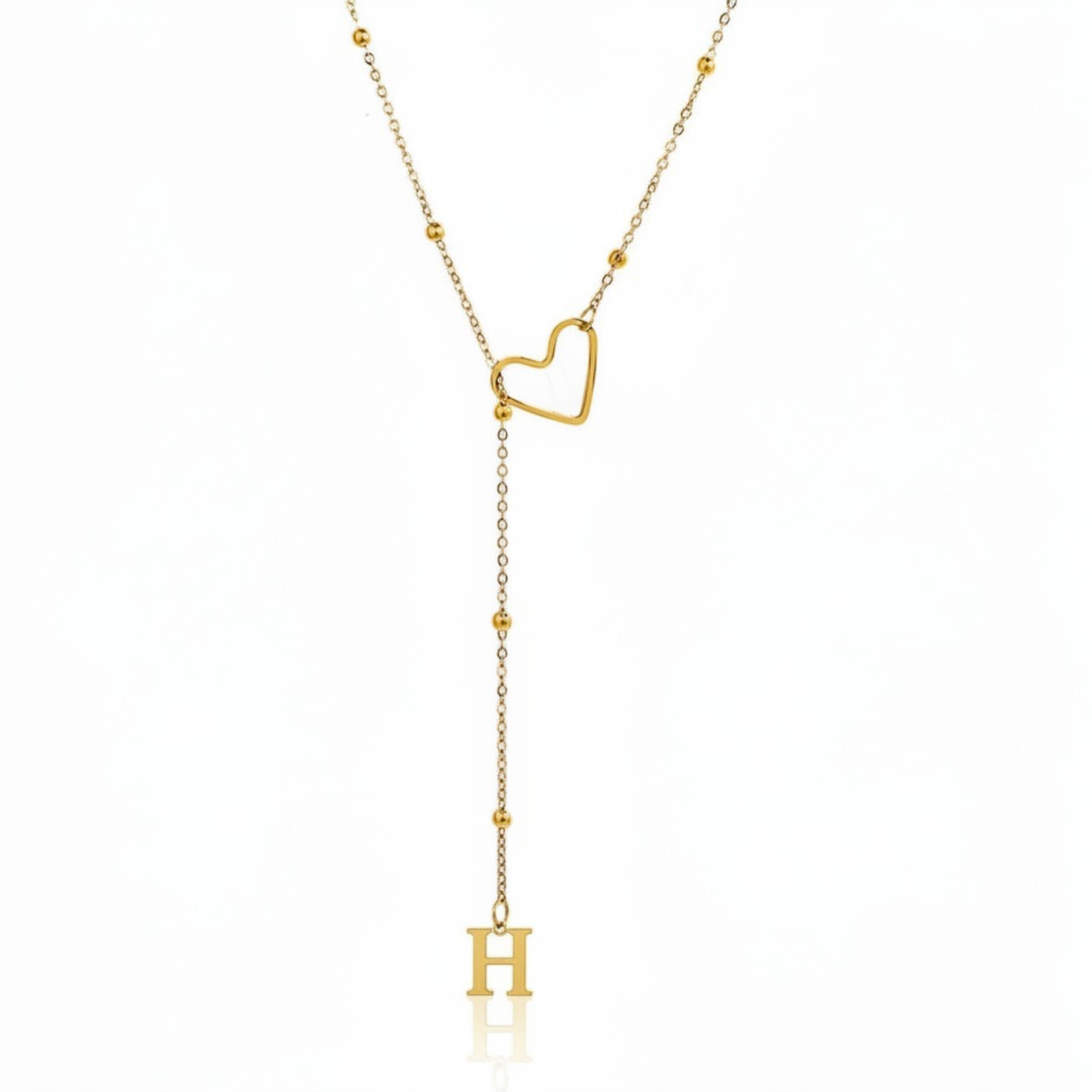 Ten wyrafinowany naszyjnik uchwyca istotę osobistej więzi: delikatnie zawieszona litera przechodzi przez złote serce, symbolizując głębokie i intymne przywiązanie.