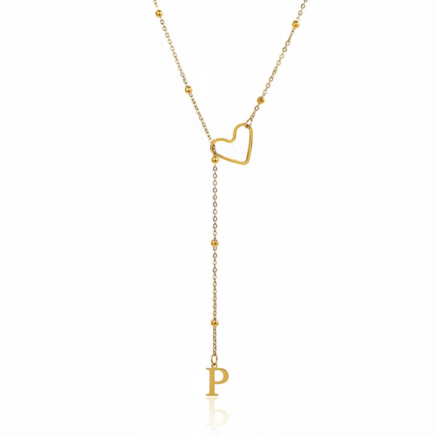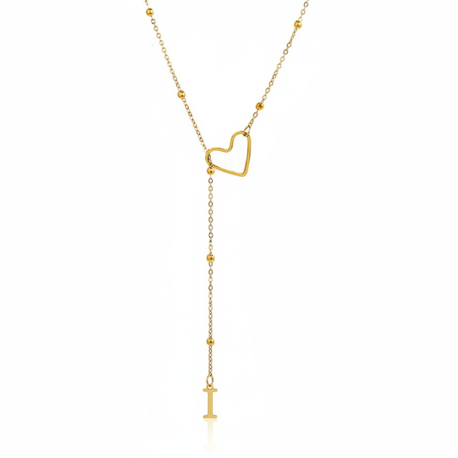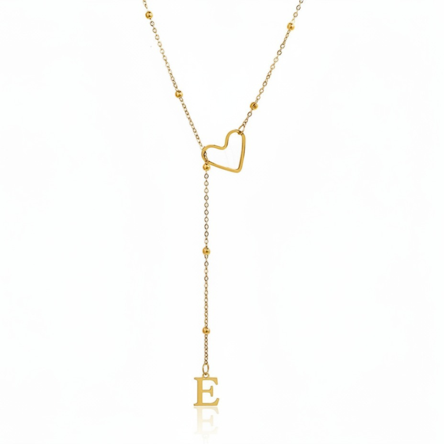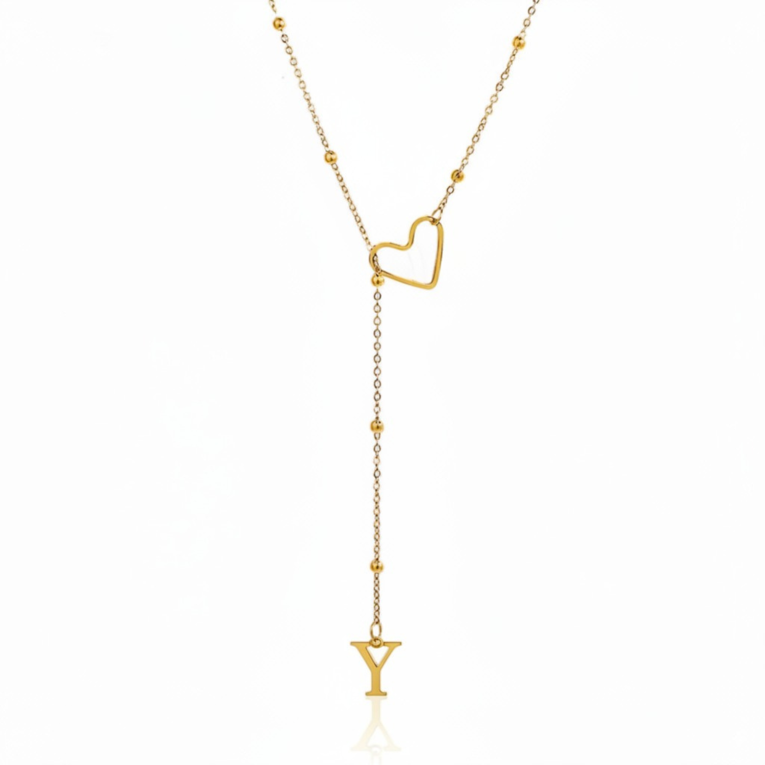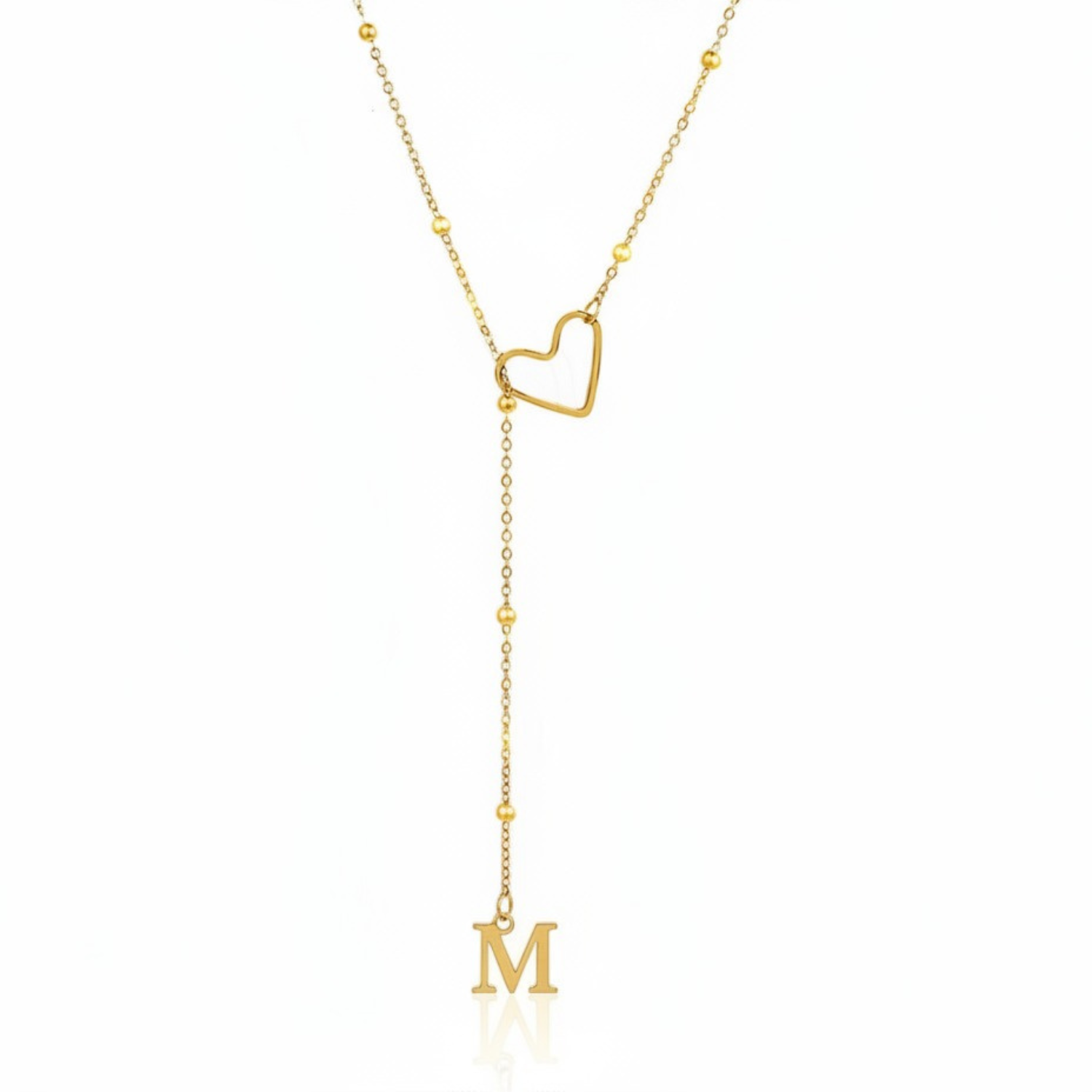 Ten wyrafinowany naszyjnik uchwyca istotę osobistej więzi: delikatnie zawieszona litera przechodzi przez złote serce, symbolizując głębokie i intymne przywiązanie.