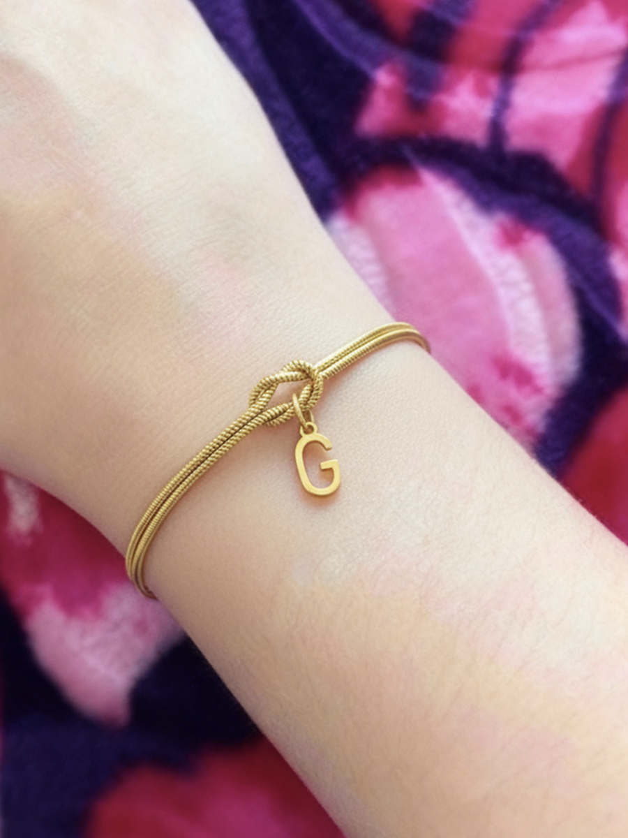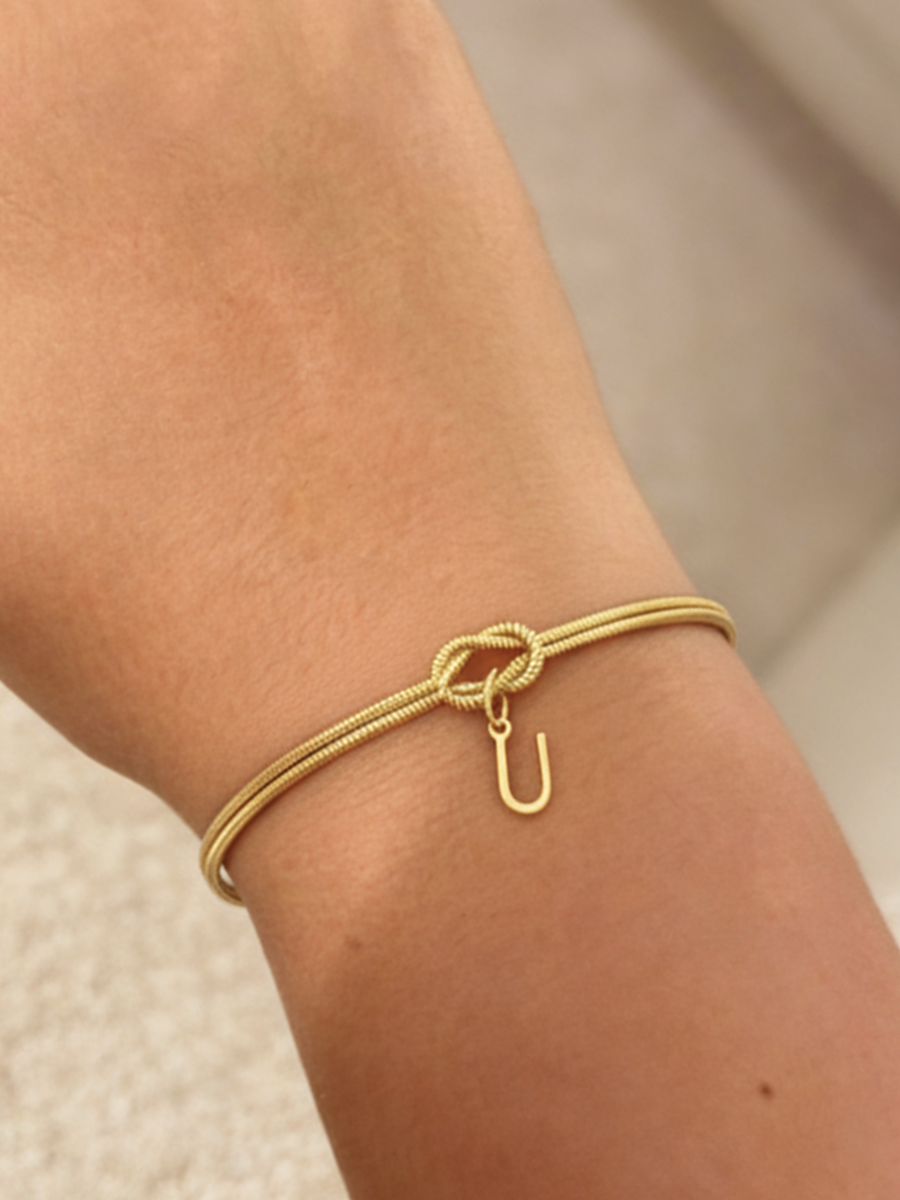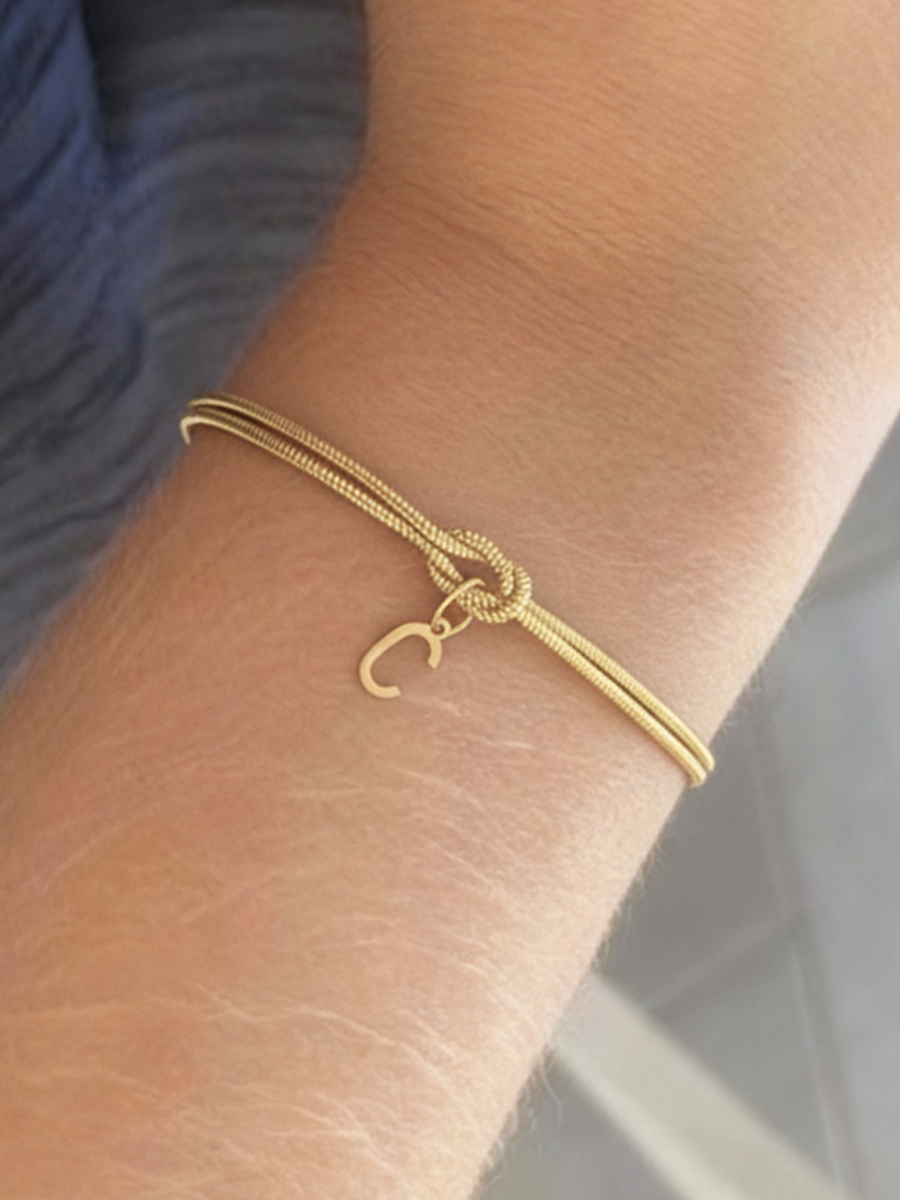 Ogniwo, które wybierasz, by nosić codziennie. Ta smukła, nowoczesna bransoletka łączy elegancki łańcuszek typu snake z symbolicznym węzłem, zawieszając spersonalizowaną inicjał, by wyrazić silne przywiązanie. Subtelny detal, który mówi wiele: czy to Twoja własna litera, czy bliskiej osoby, pozostaje cenny i bliski Tobie.