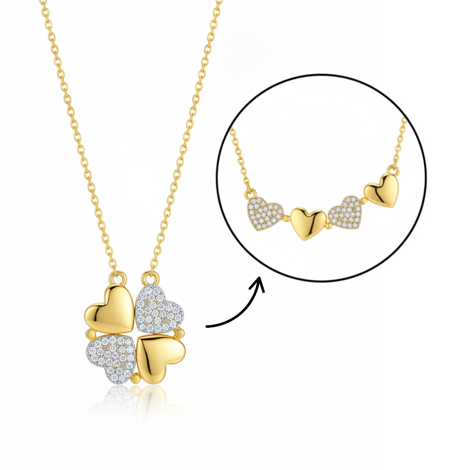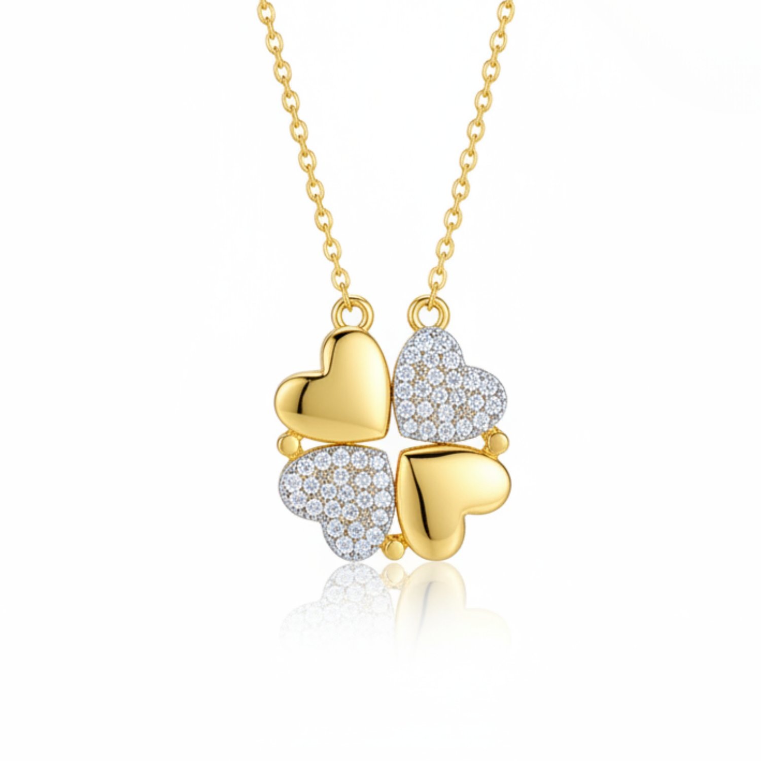 Ten naszyjnik ma cztery złote serca, dwa lśniące kryształami, dwa delikatnie polerowane, które razem tworzą subtelny czterolistny koniczynę. Sprytny projekt łączący romantyzm i szczęście, stworzony, by towarzyszyć noszącemu z gracją i znaczeniem.