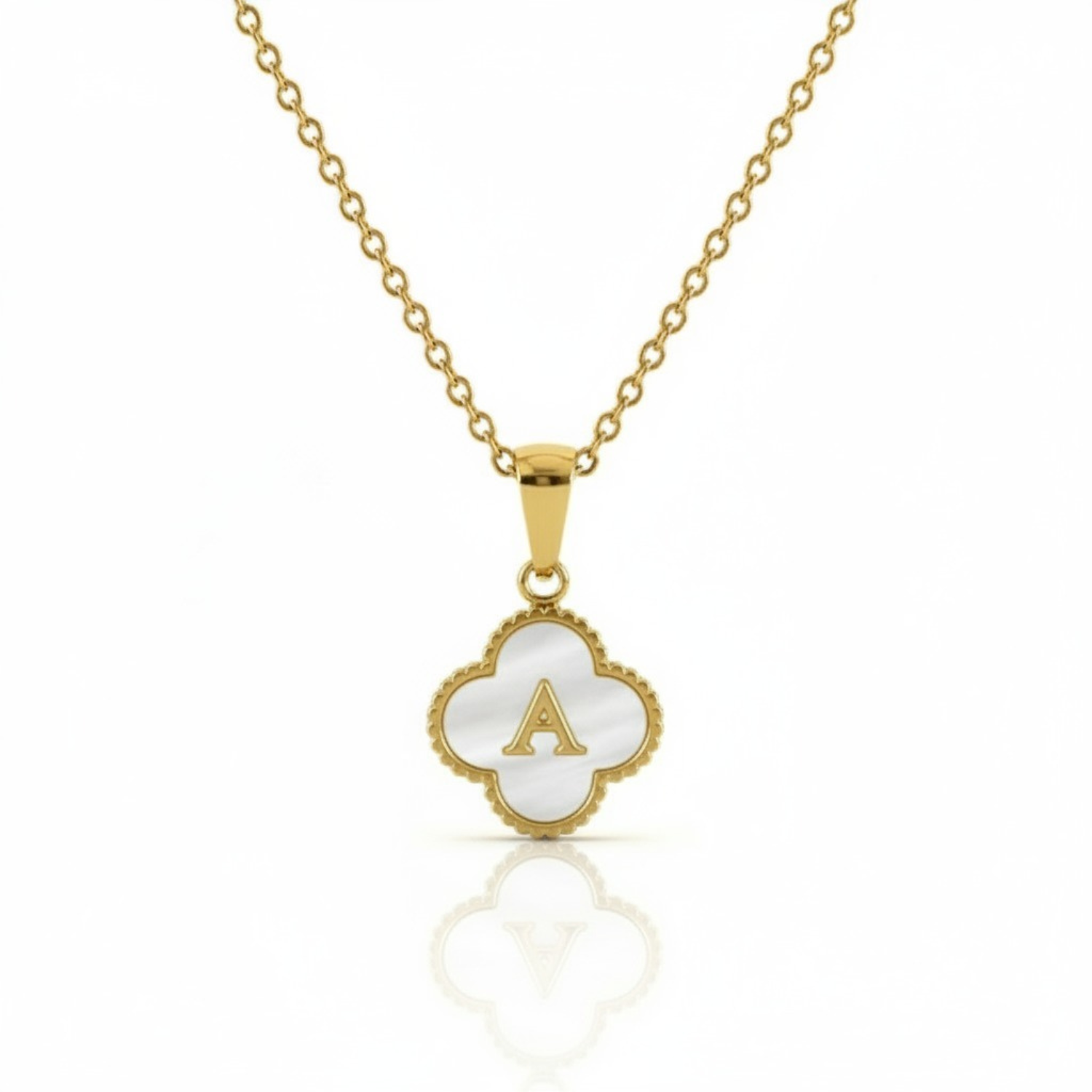 Ten wyrafinowany naszyjnik łączy elegancję z personalizacją w projekcie delikatnie inspirowanym szczęśliwym czterolistnym koniczyną. W jego centrum dumnie wyróżnia się wybrana przez Ciebie litera na tle promiennej masy perłowej, otoczona starannie wykonaną złotą oprawą. Zawieszka w kształcie czterolistnej koniczyny symbolizuje szczęście, czyniąc ten element idealnym jako przemyślany prezent lub osobisty talizman szczęścia.