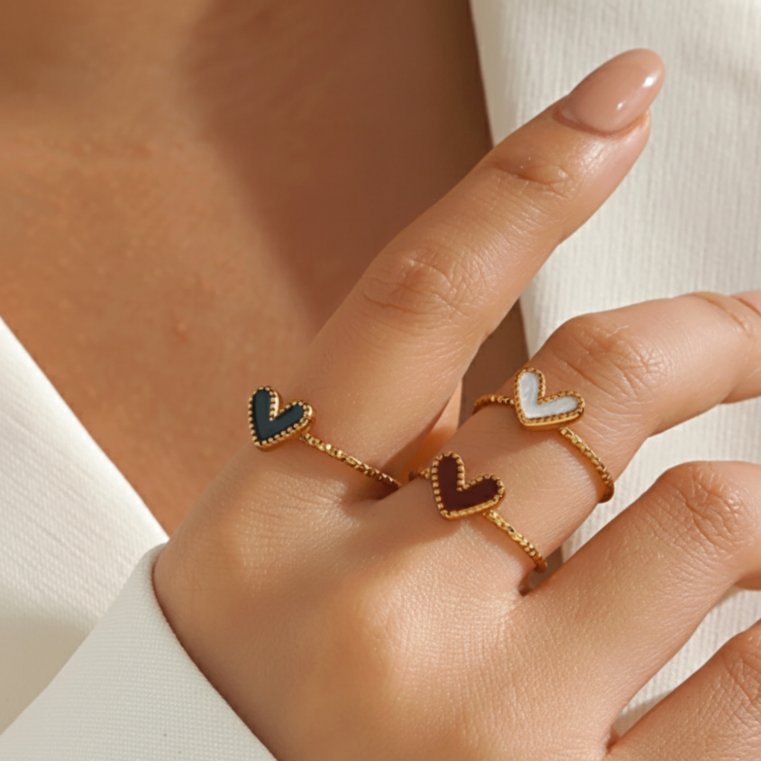 Jego młotkowany pierścień podkreśla delikatne emaliowane serce, dostępne w namiętnej czerwieni, głębokiej czerni lub perłowej bieli, z których każdy kolor niesie inną emocję, ale przekazuje tę samą wiadomość: miłość.