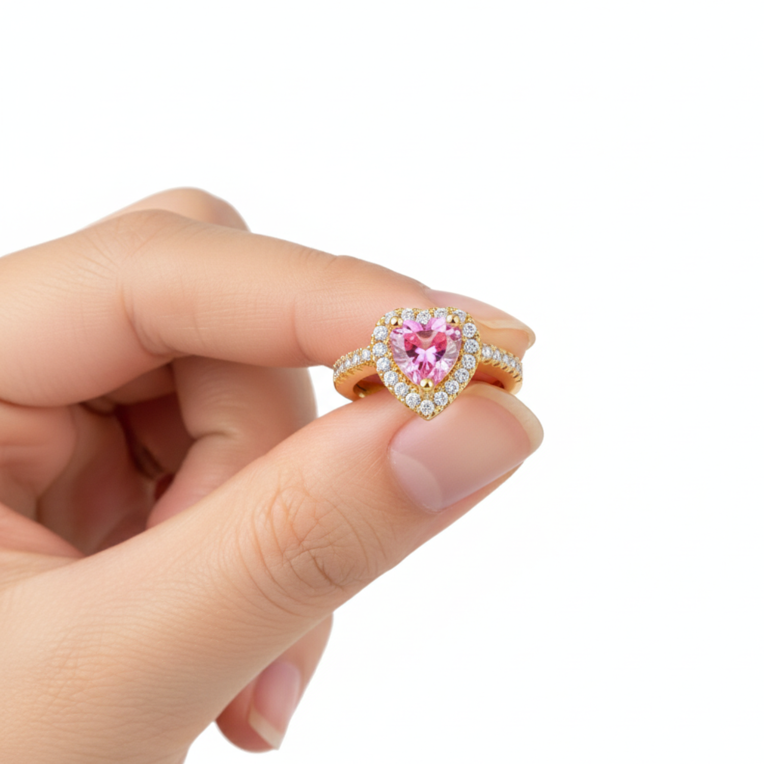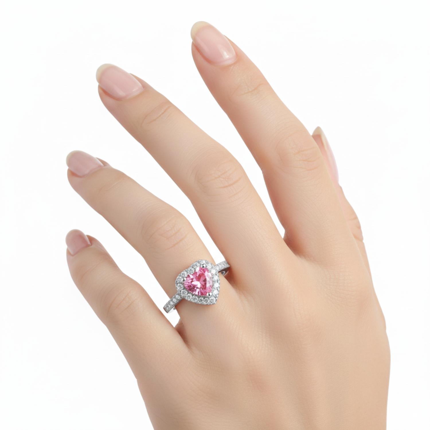 Elegancka i promienna, Rosalyn ucieleśnia czułość wiecznej miłości. W jej centrum delikatnie oszlifowane różowe serce otoczone jest halo lśniących kryształów, niczym oddech emocji uchwycony w świetle.