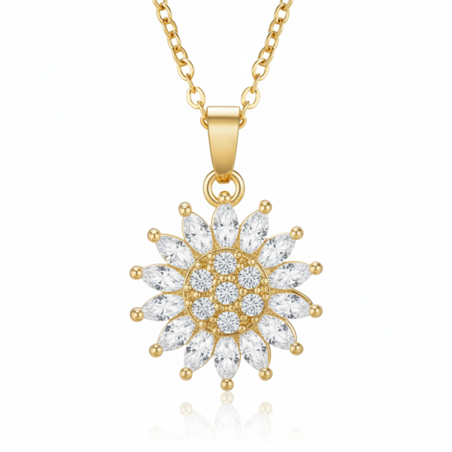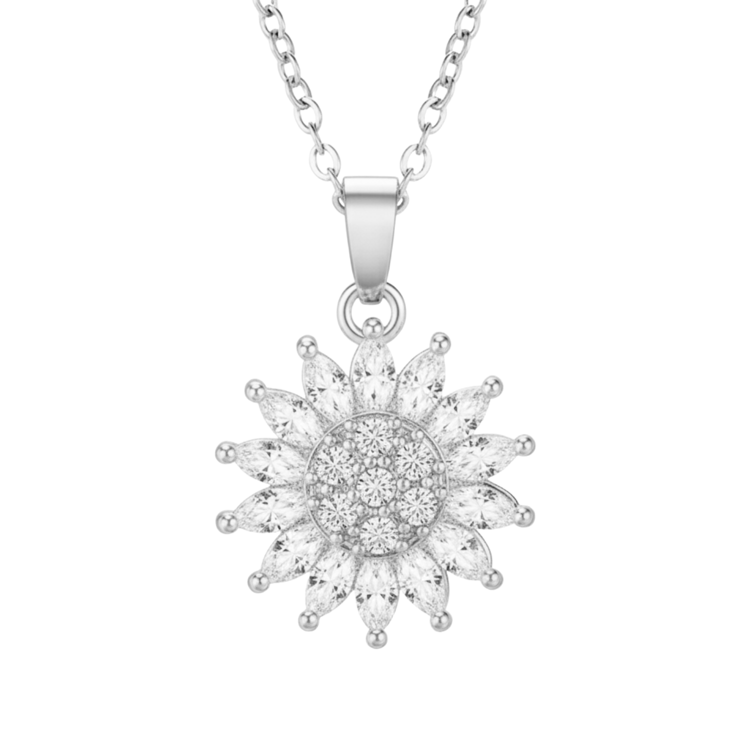 Błyszcz pięknem, nosząc ten elegancki naszyjnik z obracającym się wisiorkiem w kształcie słonecznika. Każdy lśniący płatek jest starannie osadzony w migoczących cyrkoniach, które łapią światło przy każdym ruchu. Dzięki dyskretnemu mechanizmowi obrotowemu, wisiorek może się obracać wokół własnej osi, dodając zabawny i hipnotyzujący akcent tej wyrafinowanej biżuterii.