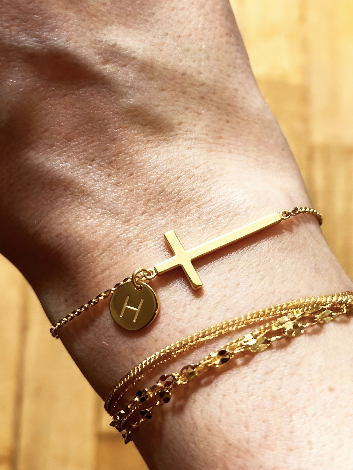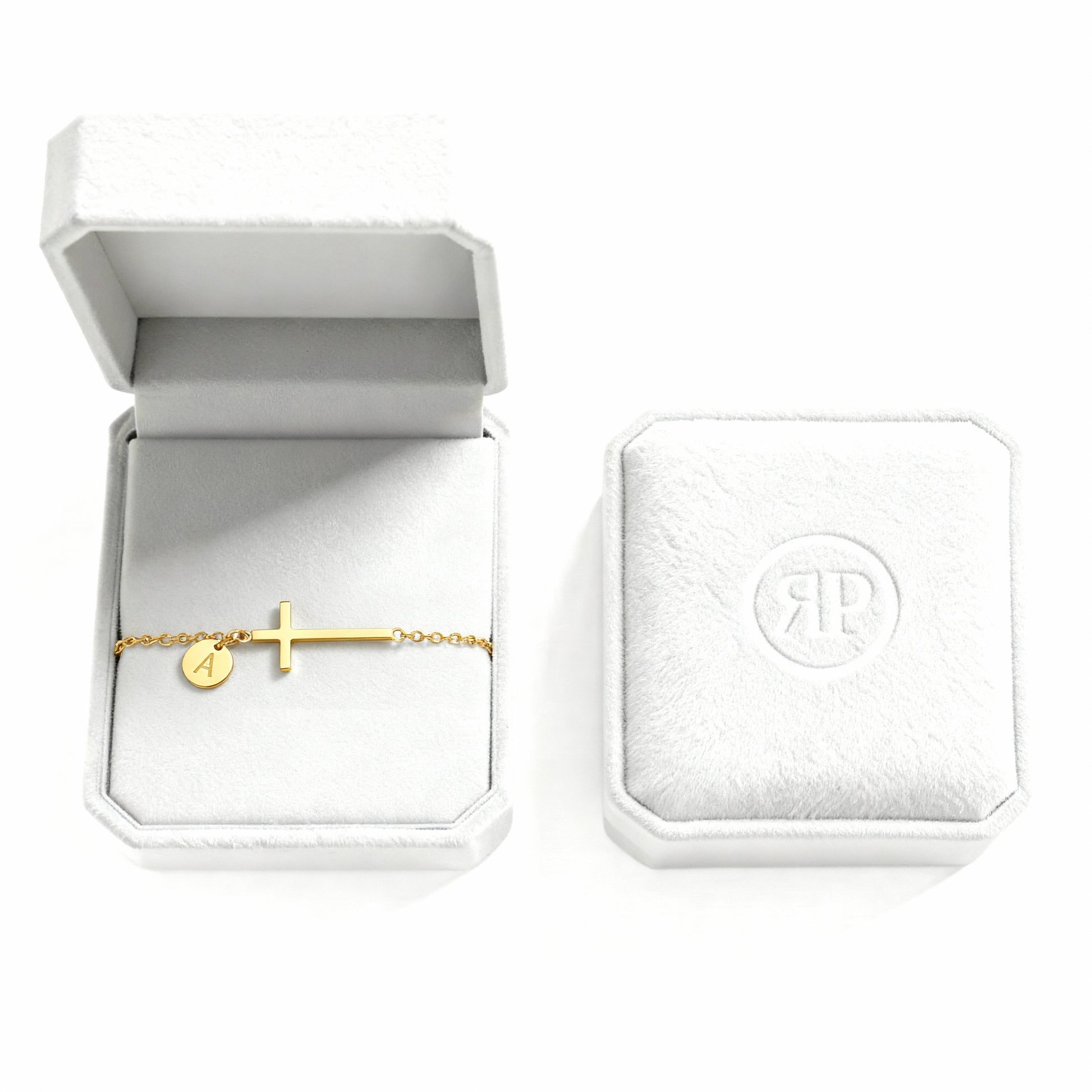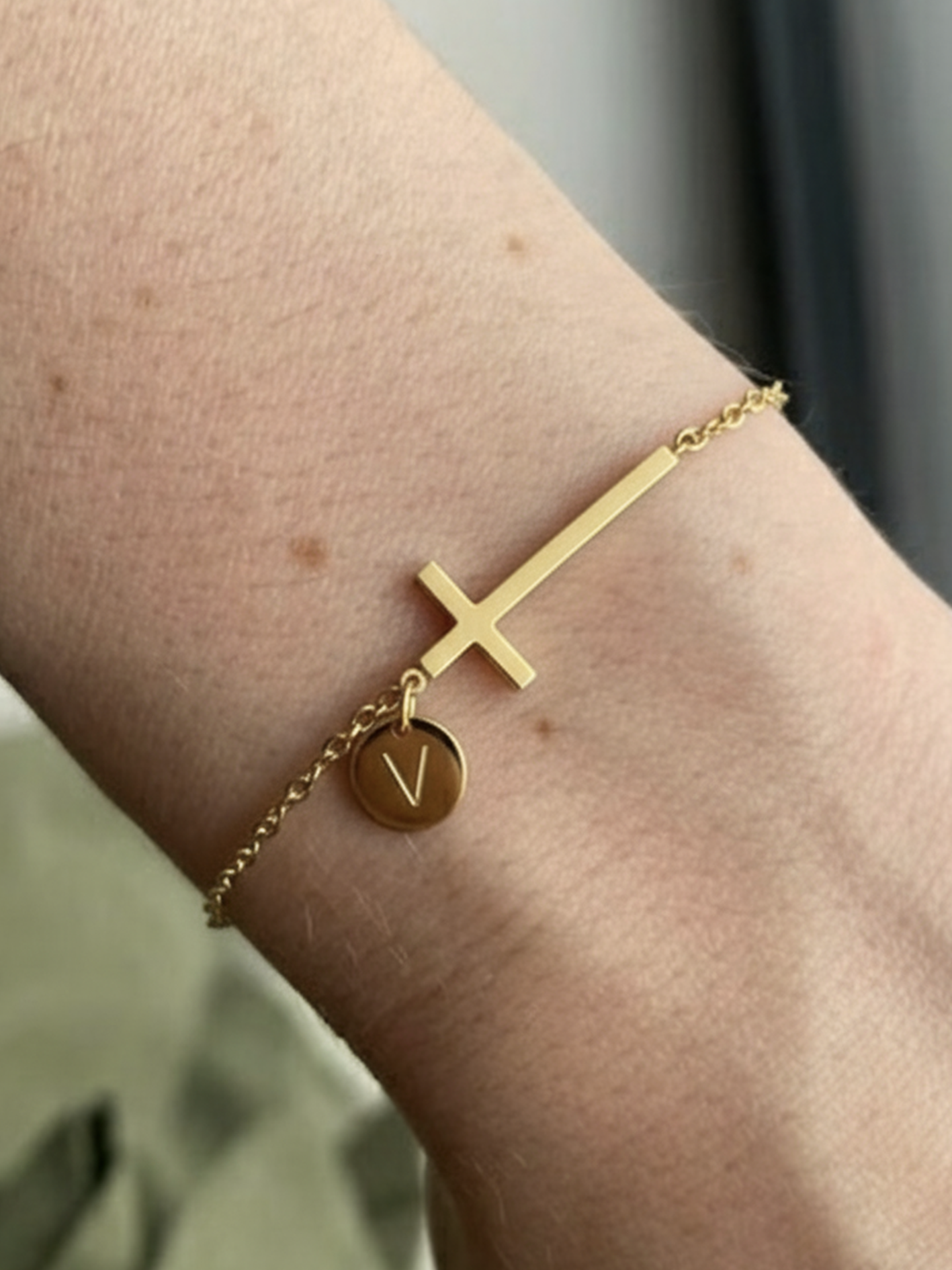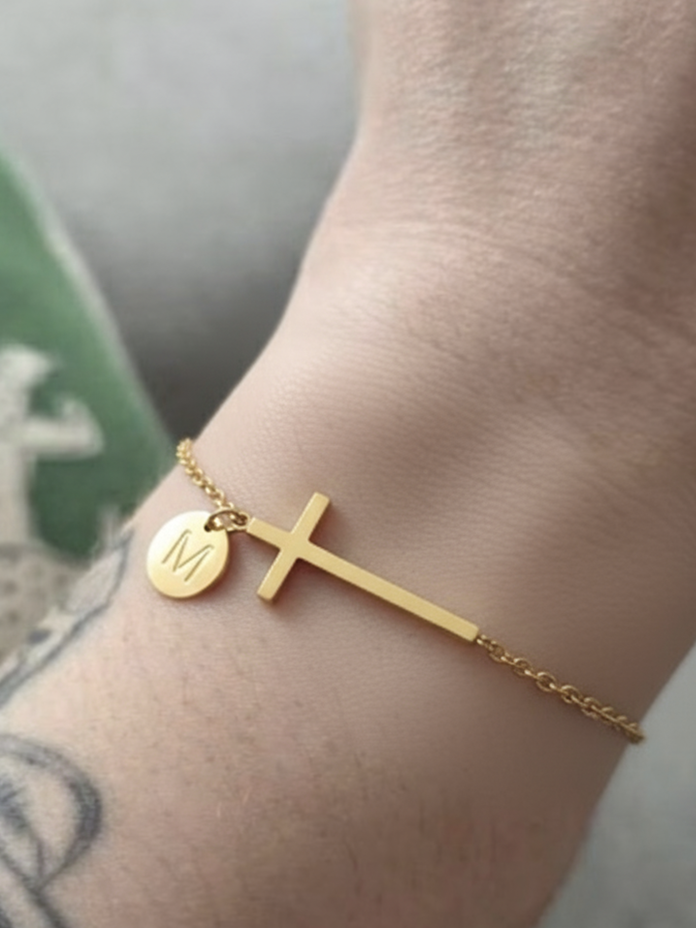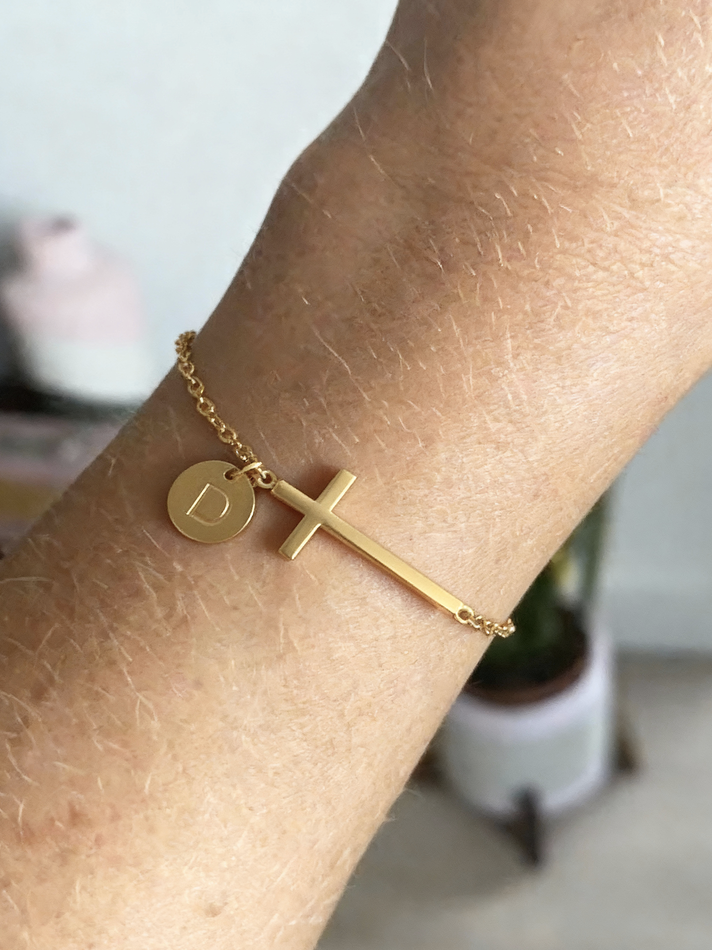 Bransoletka w złotym odcieniu z eleganckim krzyżem i spersonalizowanym zawieszonym inicjałem. Ten minimalistyczny design łączy w sobie wiarę i tożsamość w jednym pięknym elemencie.